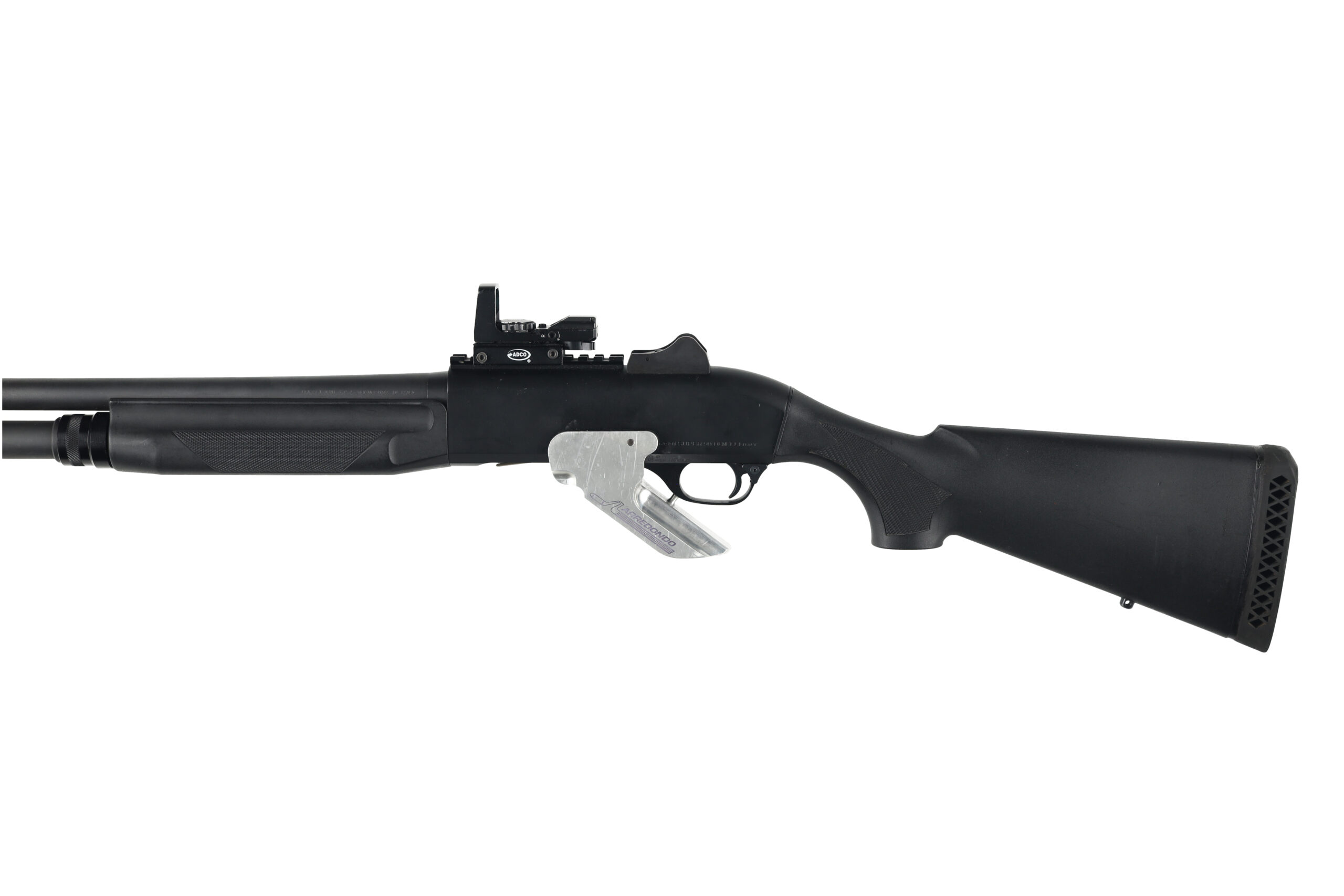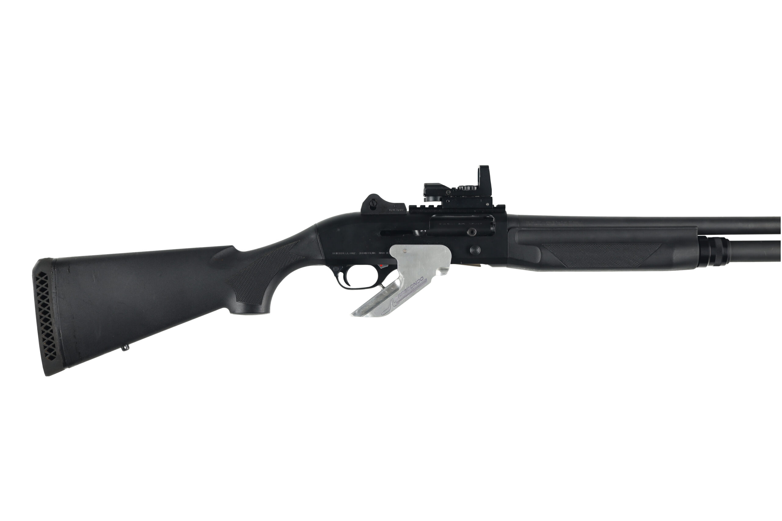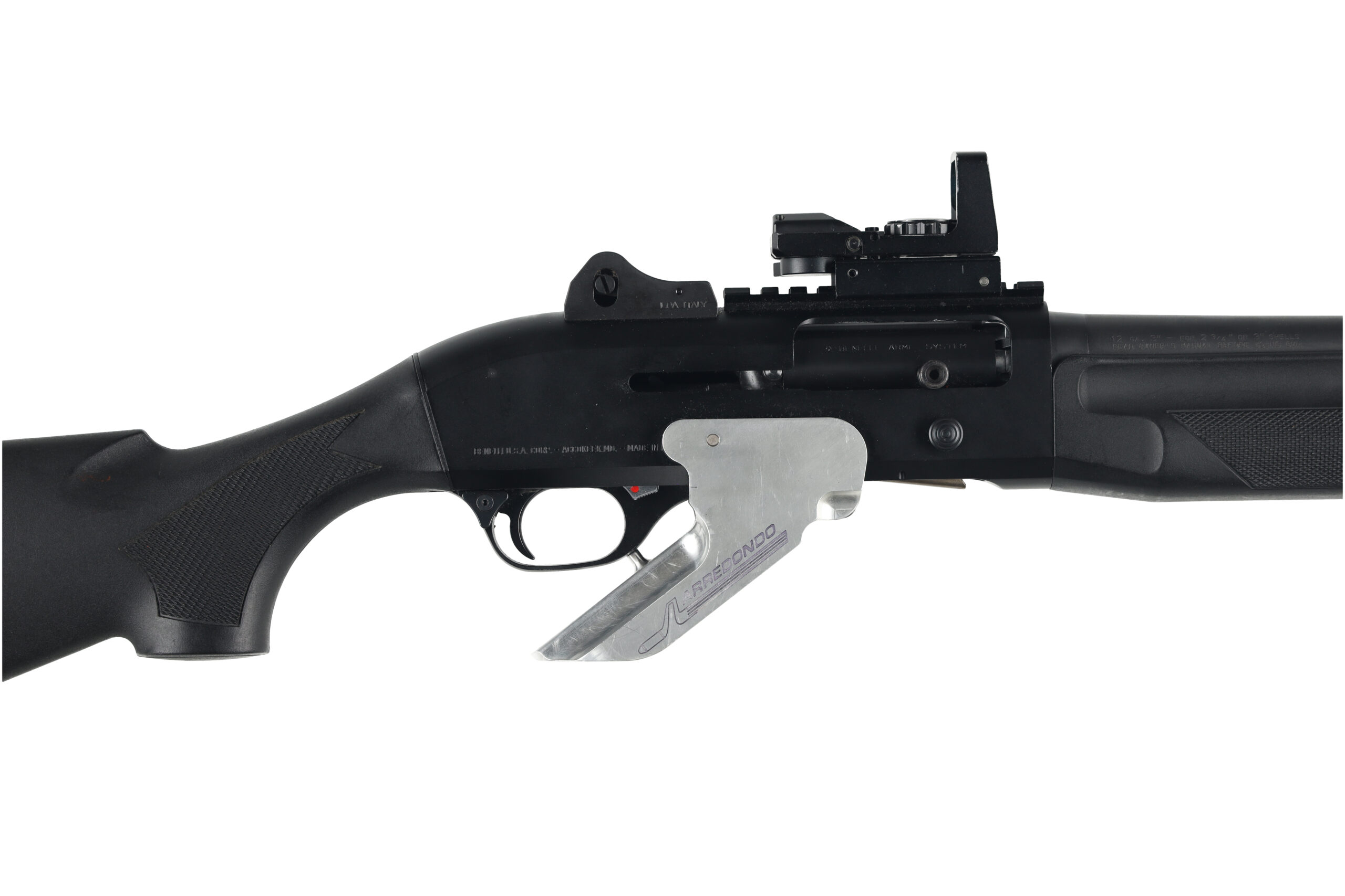 The Benelli M1 Super 90 Practical was designed specifically for use in IPSC competition, and utilizes an extended tube, ported barrel, muzzle break and oversized controls. This used example has had its factory 8 shot tube swapped for a 10 shot tube and has also had a speed loading chute and Adco red dot added. Overall condition is good to very good, with mild wear.