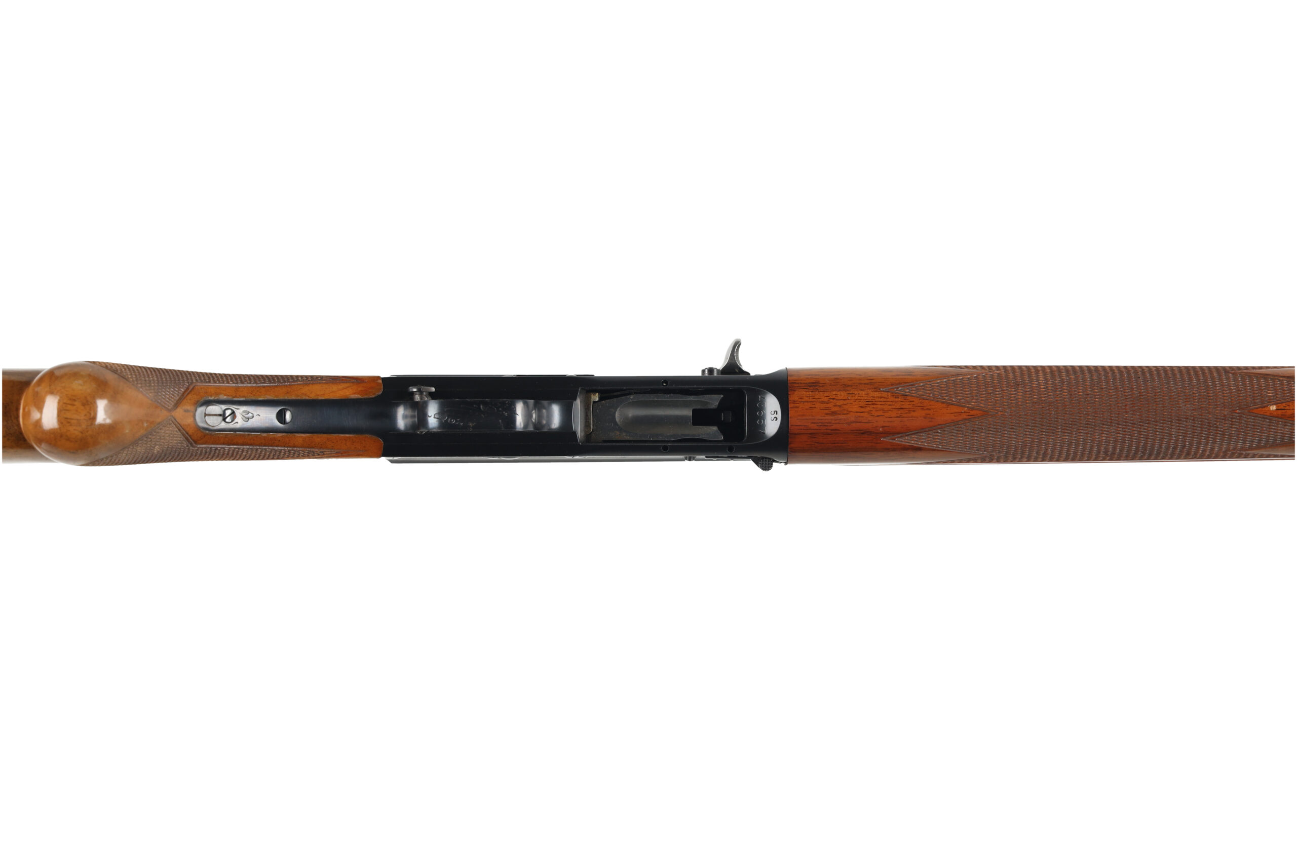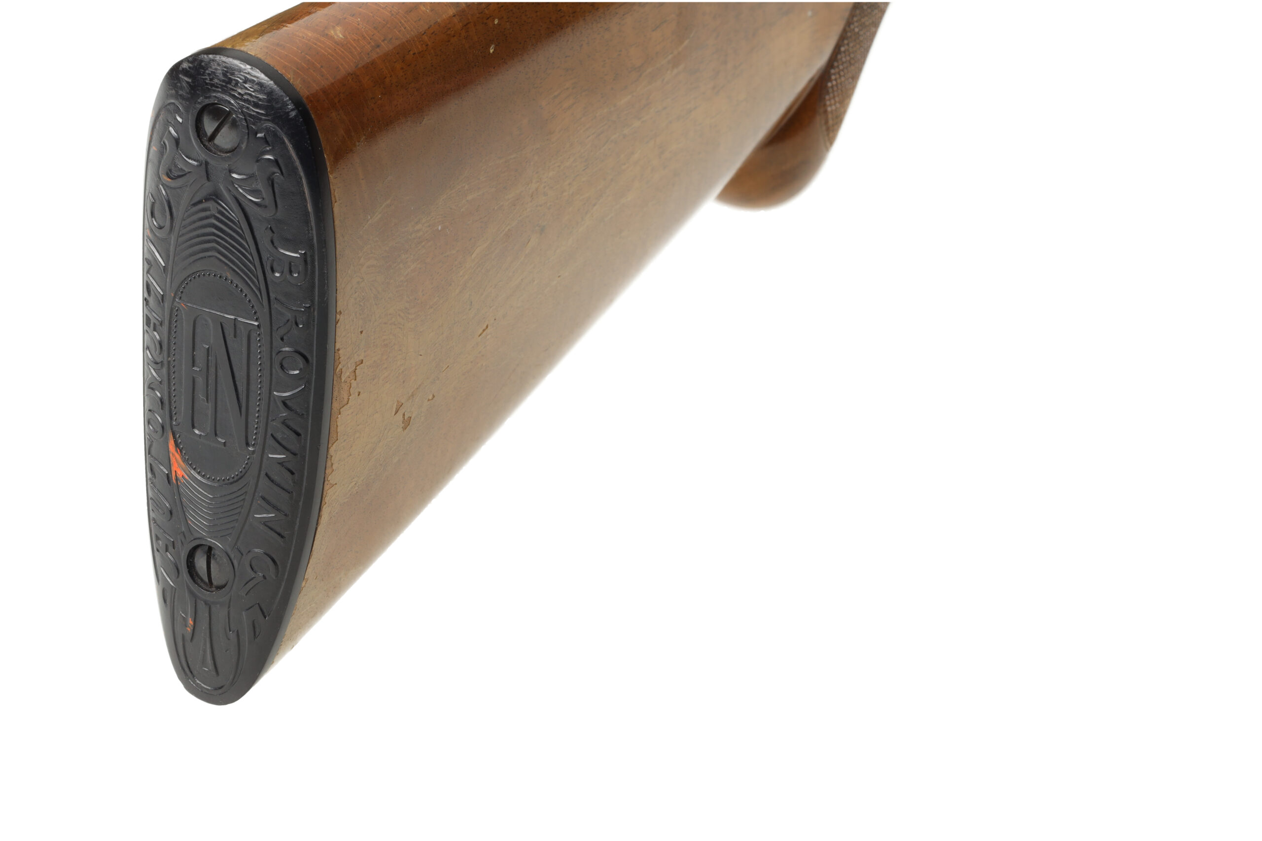 The Browning Auto 5 was the first commercially successful, mass produced, semi automatic shotgun. It was designed by John Moses Browning in 1898 and patented in 1900, making it continuously produced in one form or another for almost 100 years. The Browning Sweet Sixteen was a side development of the successful auto 5 shotgun, using lighter weight components designed for the smaller gauge shotshells. This example of the A5 Sweet Sixteen is in very good overall condition, with only light to mild wear. like many firearms from the 1960’s and 70’s , the stocks were finished with a thick varnish finish, which has since cracked across much of the surface.