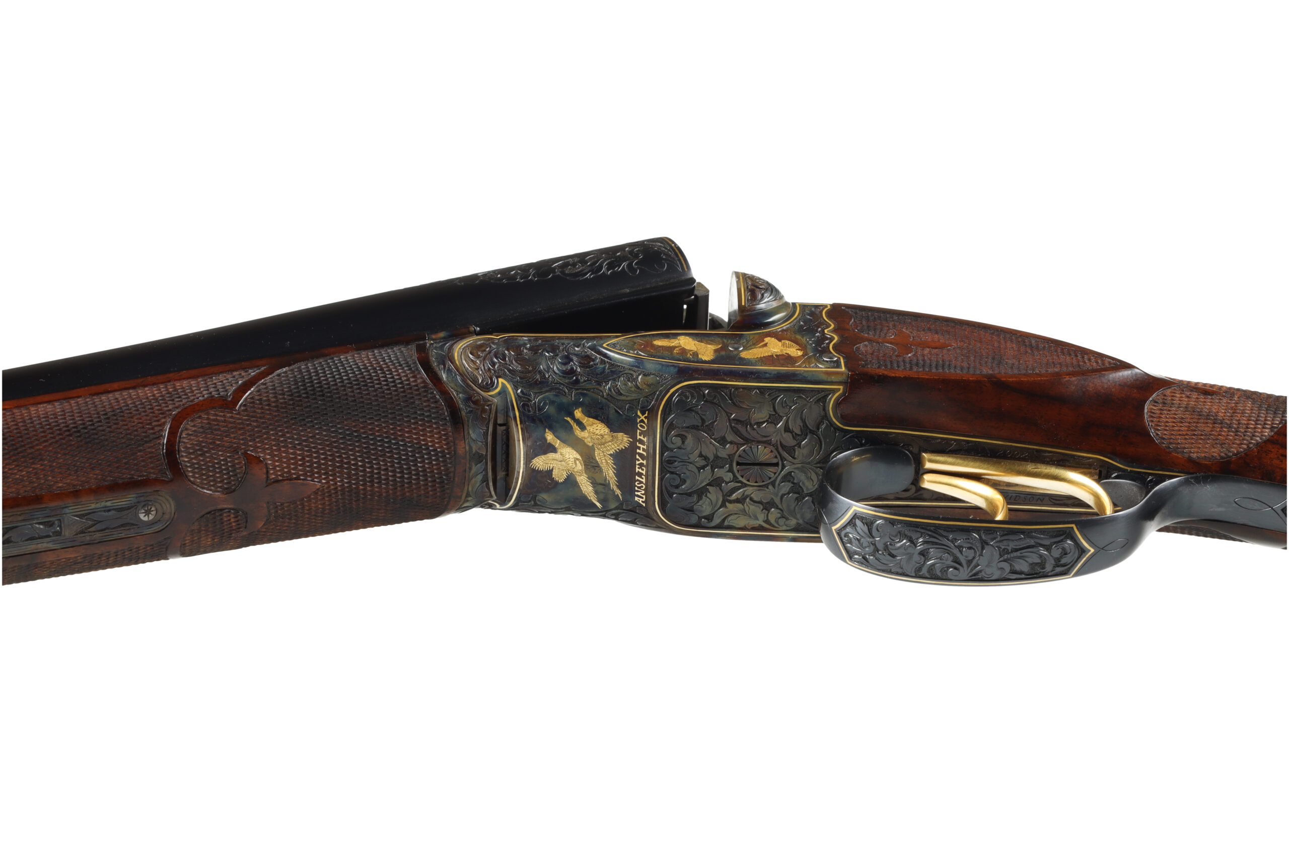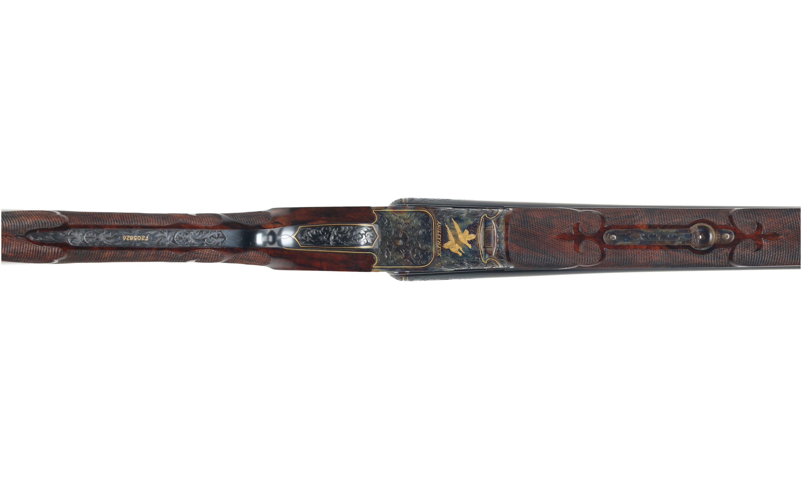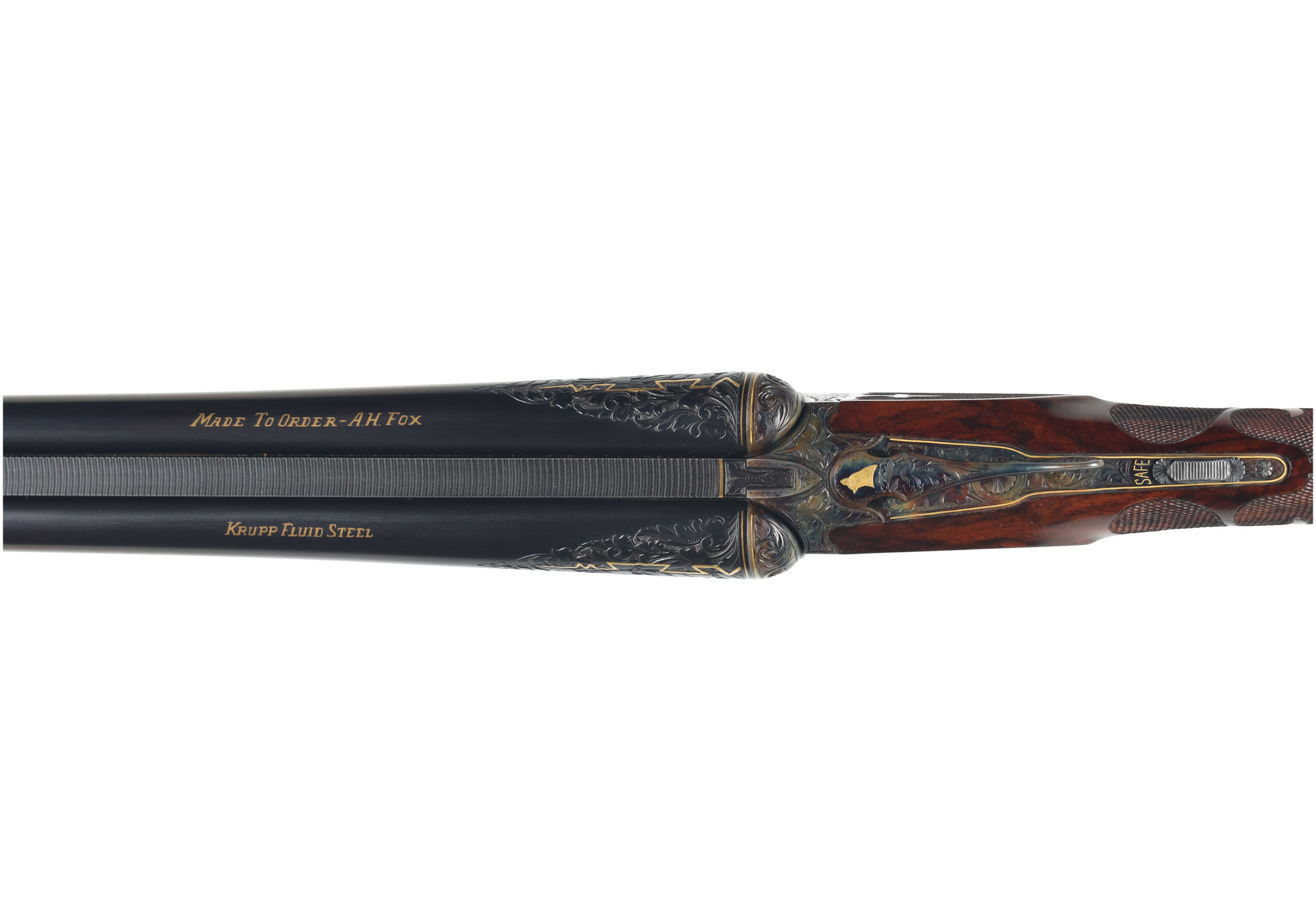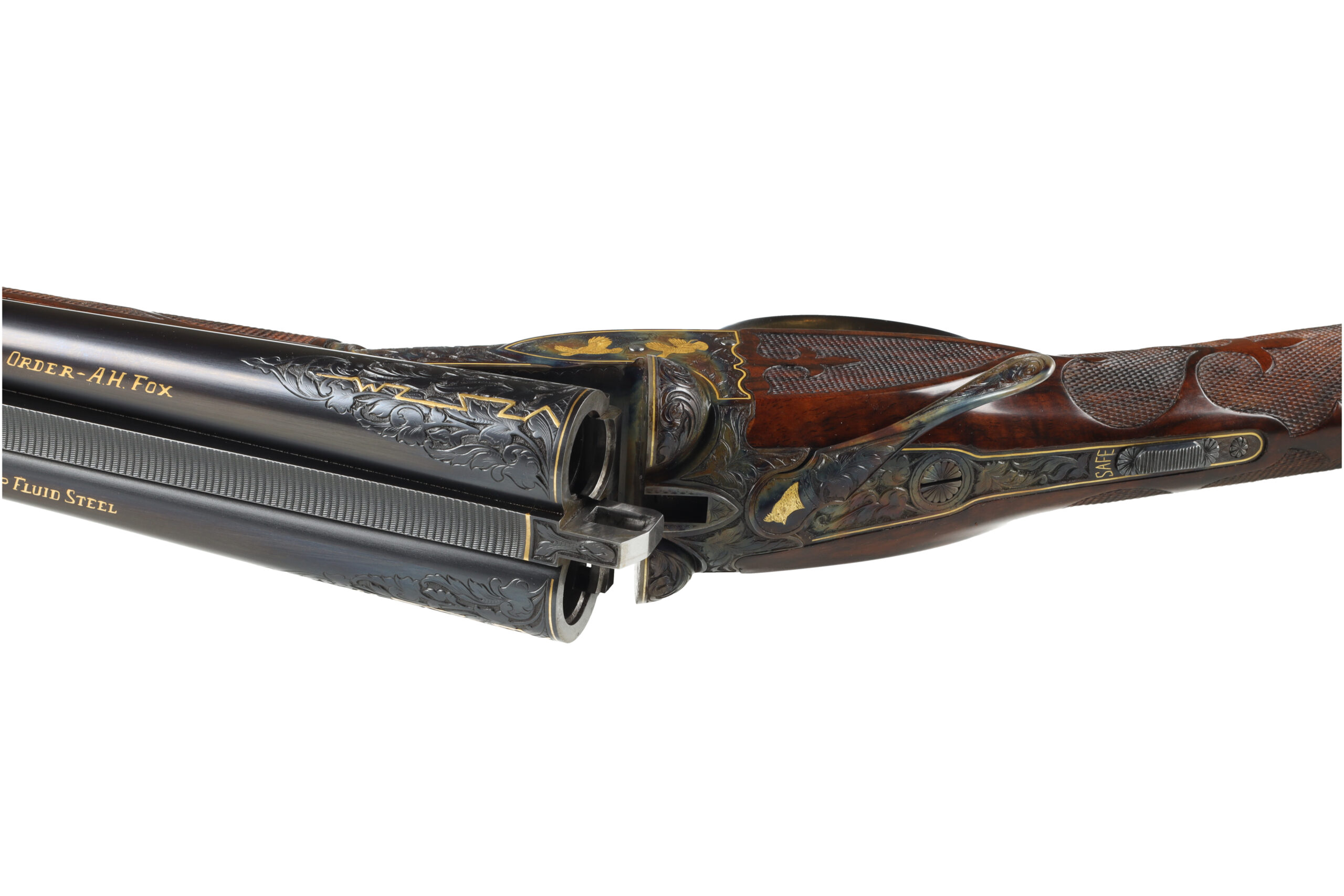 Connecticut Shotgun Manufacturing Company has been producing new, high-grade A.H. Fox shotguns for many years, with workmanship that often rivals, and in some cases surpasses the originals. This 28 Gauge FE Grade stands as a superb example of their artistry, featuring intricate hand engraving that flows across the receiver and extends onto the barrels, enhanced by refined gold inlays. The shotgun is fitted with beautifully figured Turkish walnut stocks, elegantly checkered in a classic fleur-de-lis pattern.