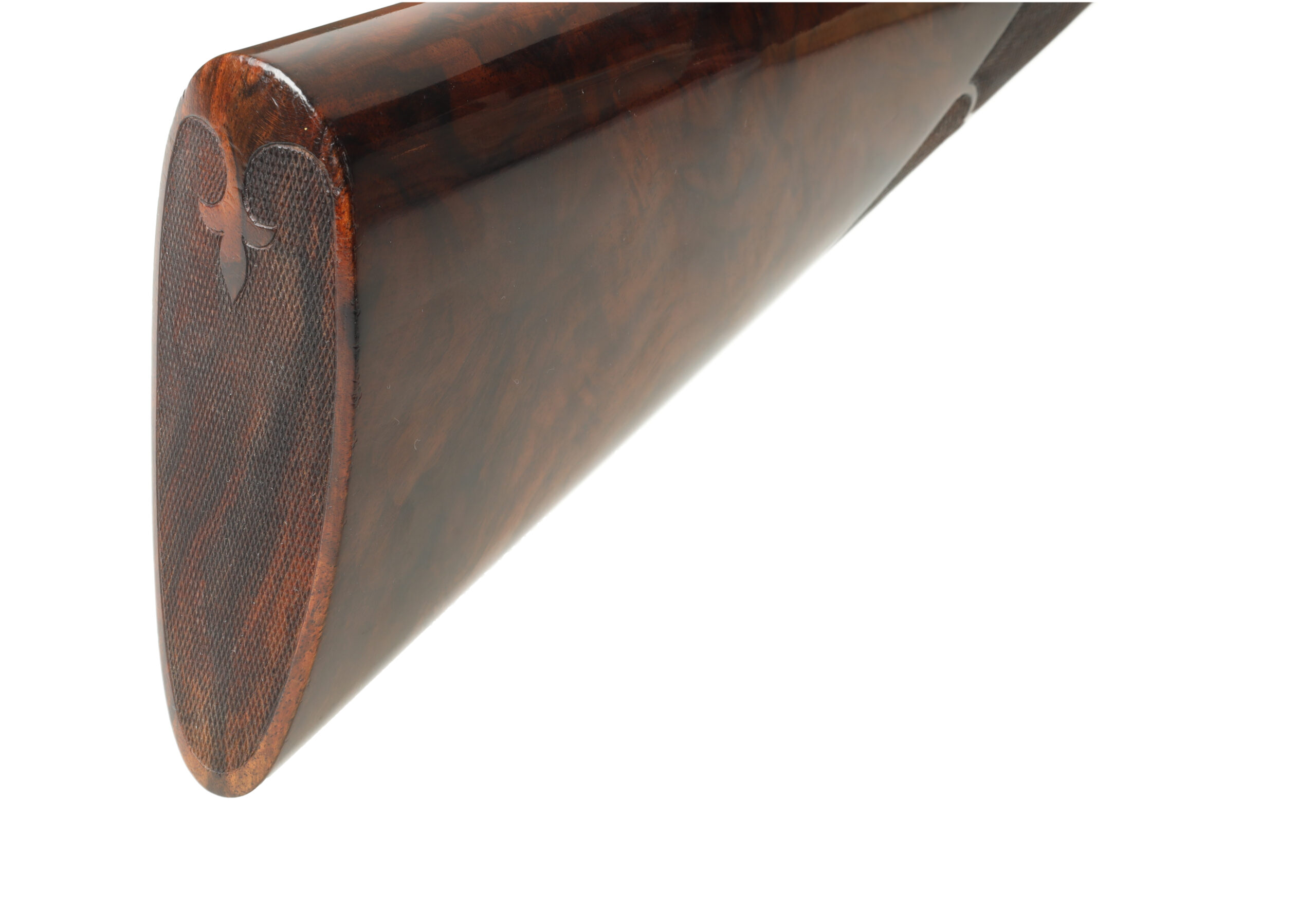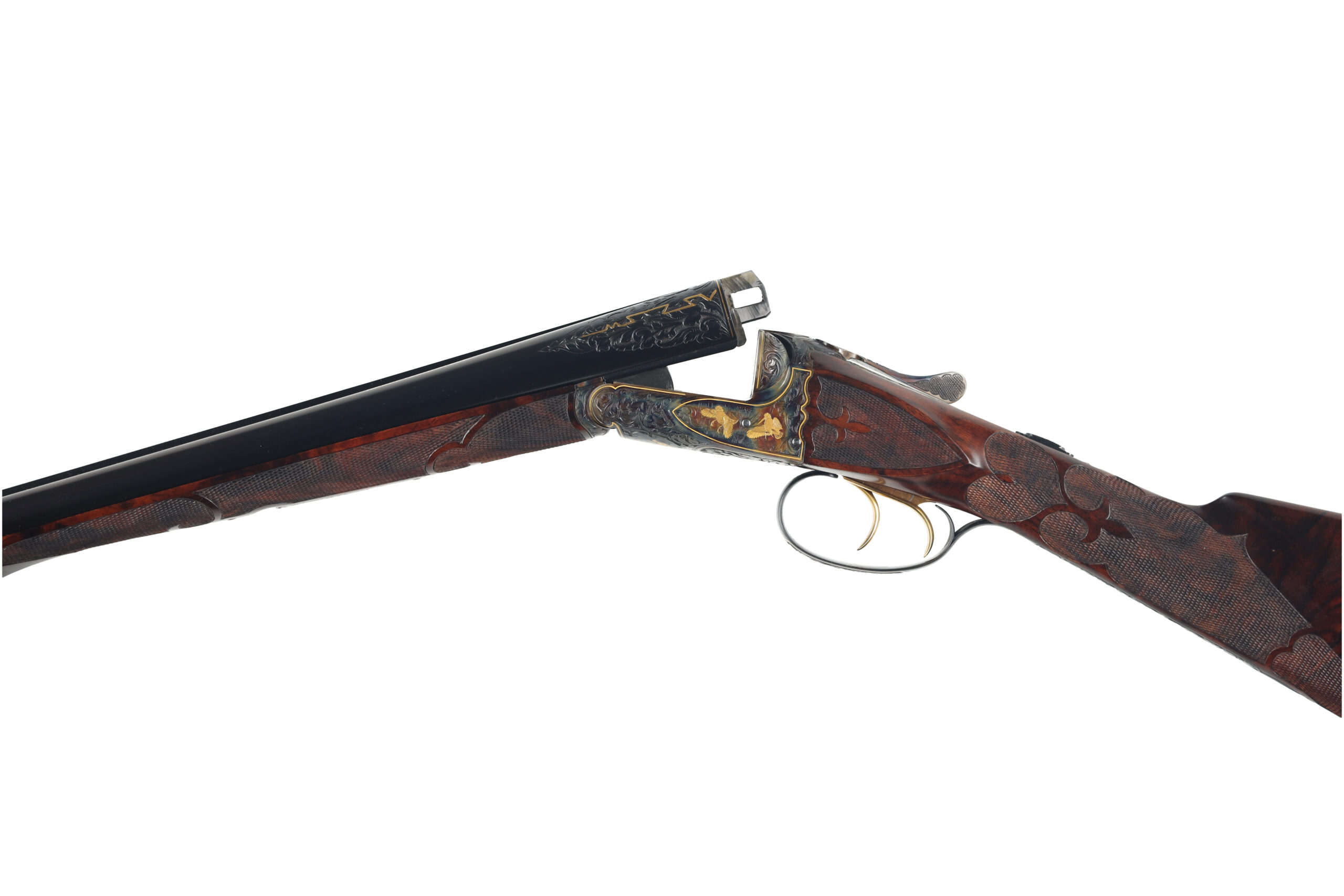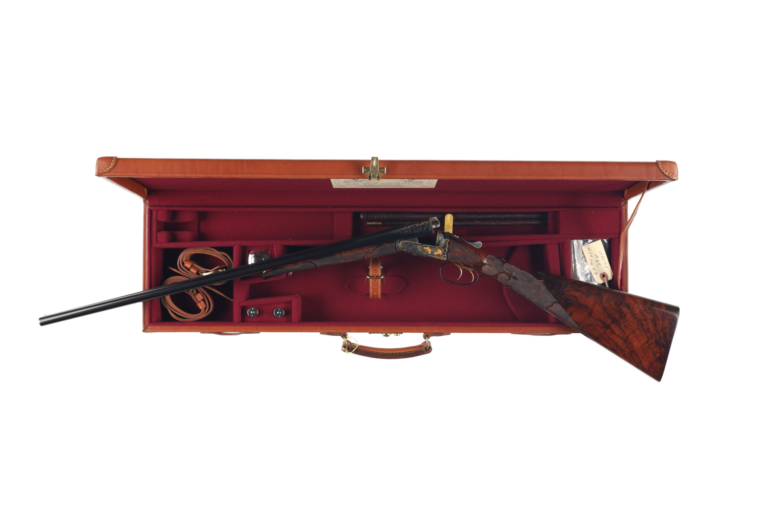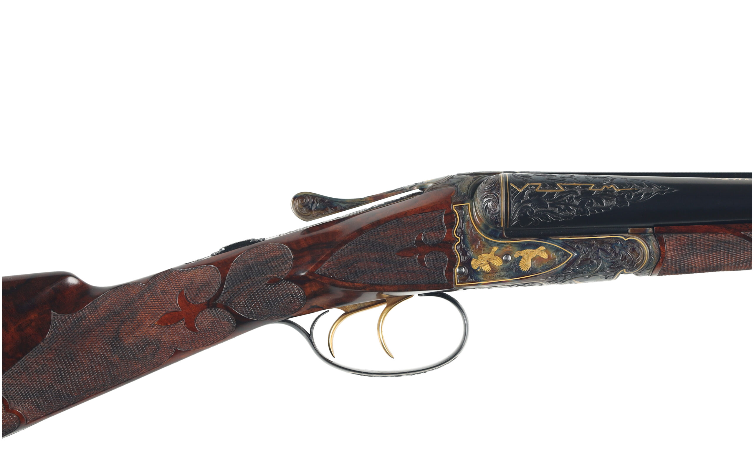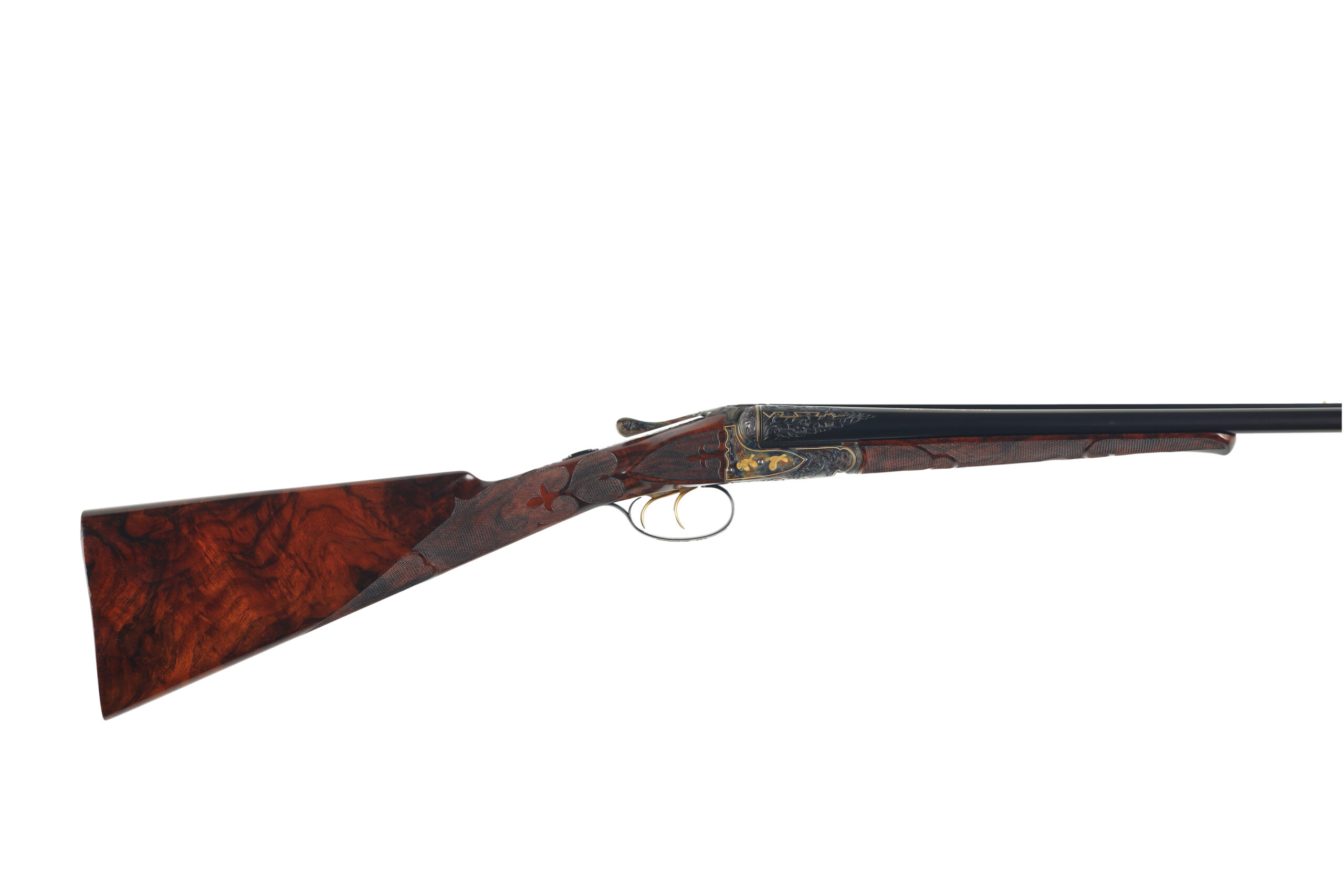 Connecticut Shotgun Manufacturing Company has been producing new, high-grade A.H. Fox shotguns for many years, with workmanship that often rivals, and in some cases surpasses the originals. This 28 Gauge FE Grade stands as a superb example of their artistry, featuring intricate hand engraving that flows across the receiver and extends onto the barrels, enhanced by refined gold inlays. The shotgun is fitted with beautifully figured Turkish walnut stocks, elegantly checkered in a classic fleur-de-lis pattern.