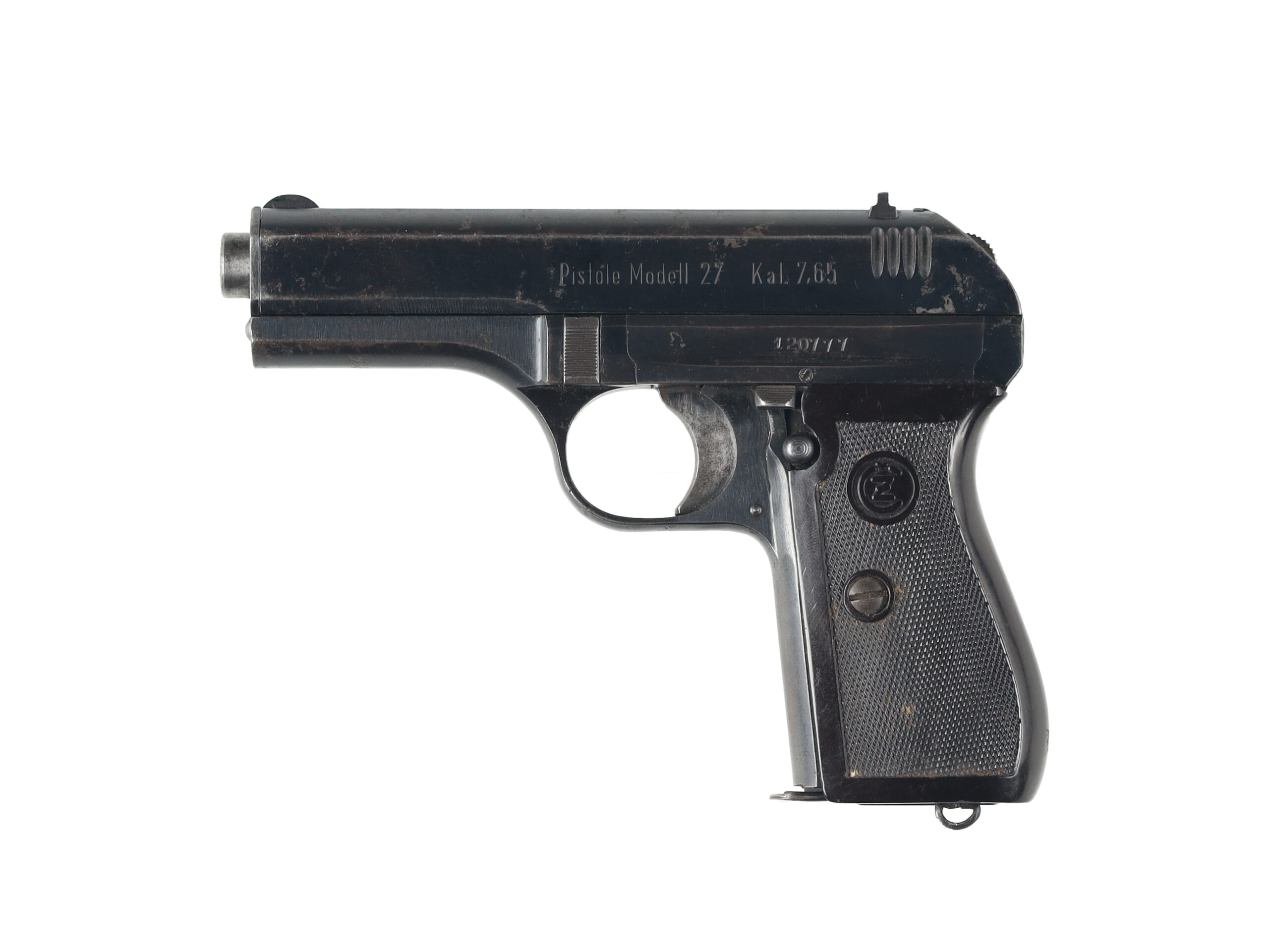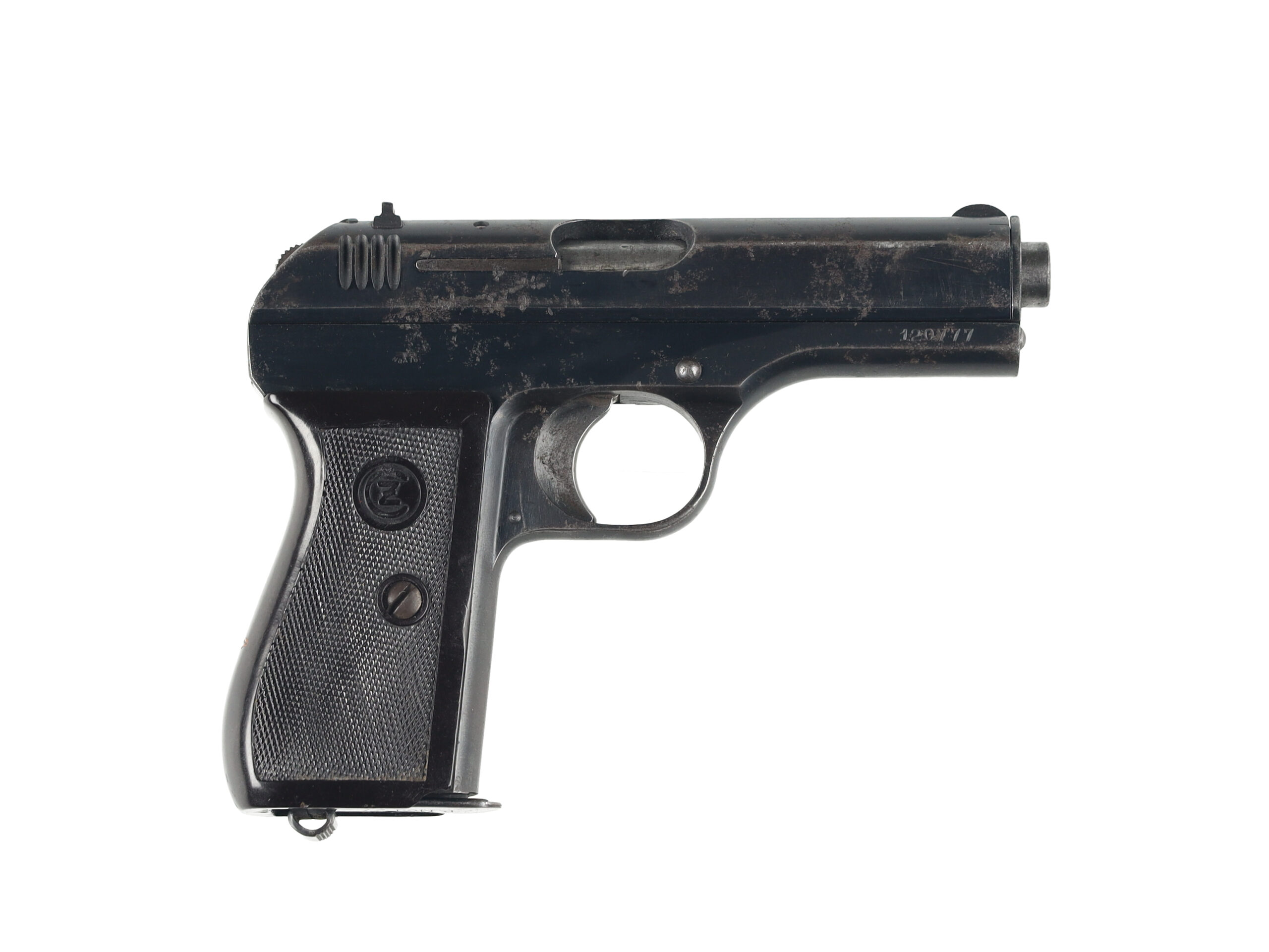 The Czech Pistole Modell 27 or VZ 27 in military use was designed after experiences during WW1, they elected to use a smaller caliber for ease of use and lighter weight, also allowing for a simplified direct blowback design. This pistol was manufactured from 1927 throughout the German occupation during WW2 and saw continued use until the 1960’s. this example appears to have been made during the German occupation with the slide marking “Böhmische Waffenfabrik AG in Prag” as well as a waffenampt on the barrel breech and right side of the frame. Overall condition is fair to good, with light pitting on the slide and frame, bit a very good to excellent bore. Mechanical function appears good.