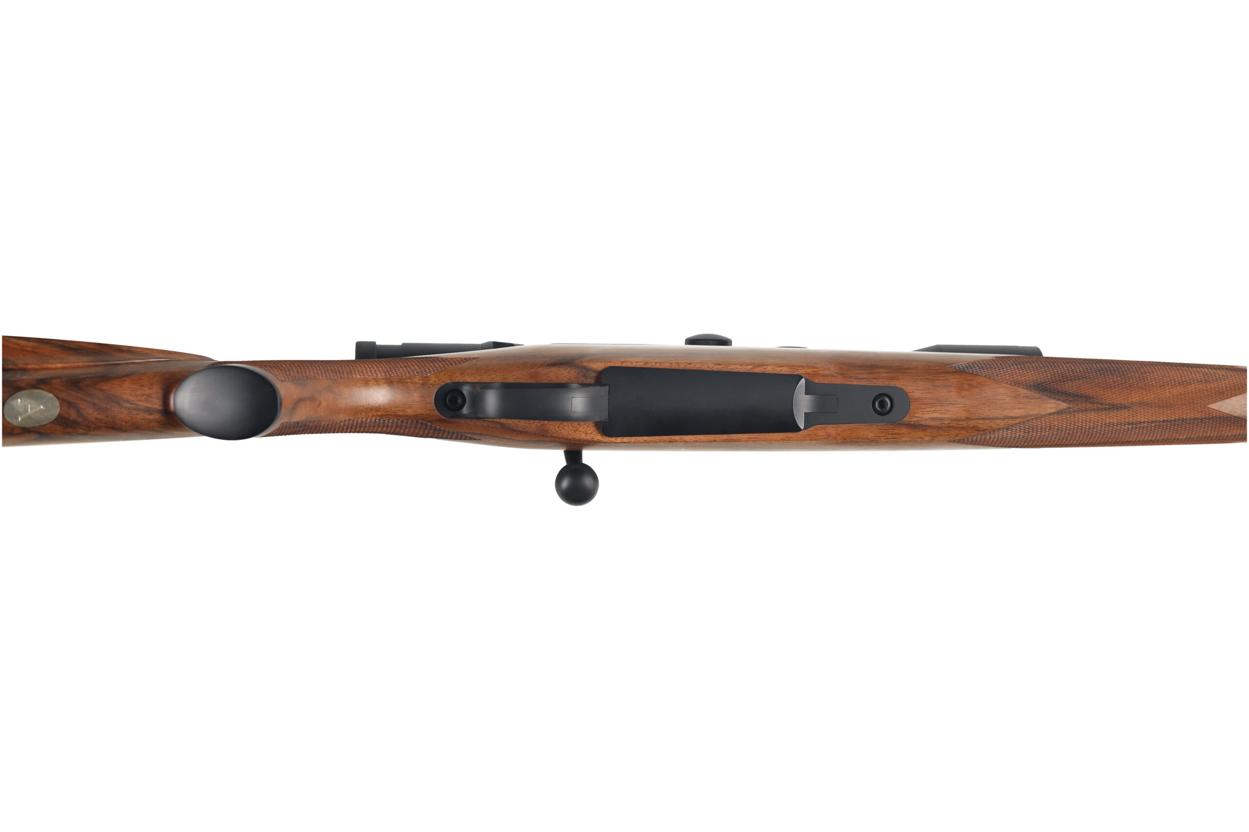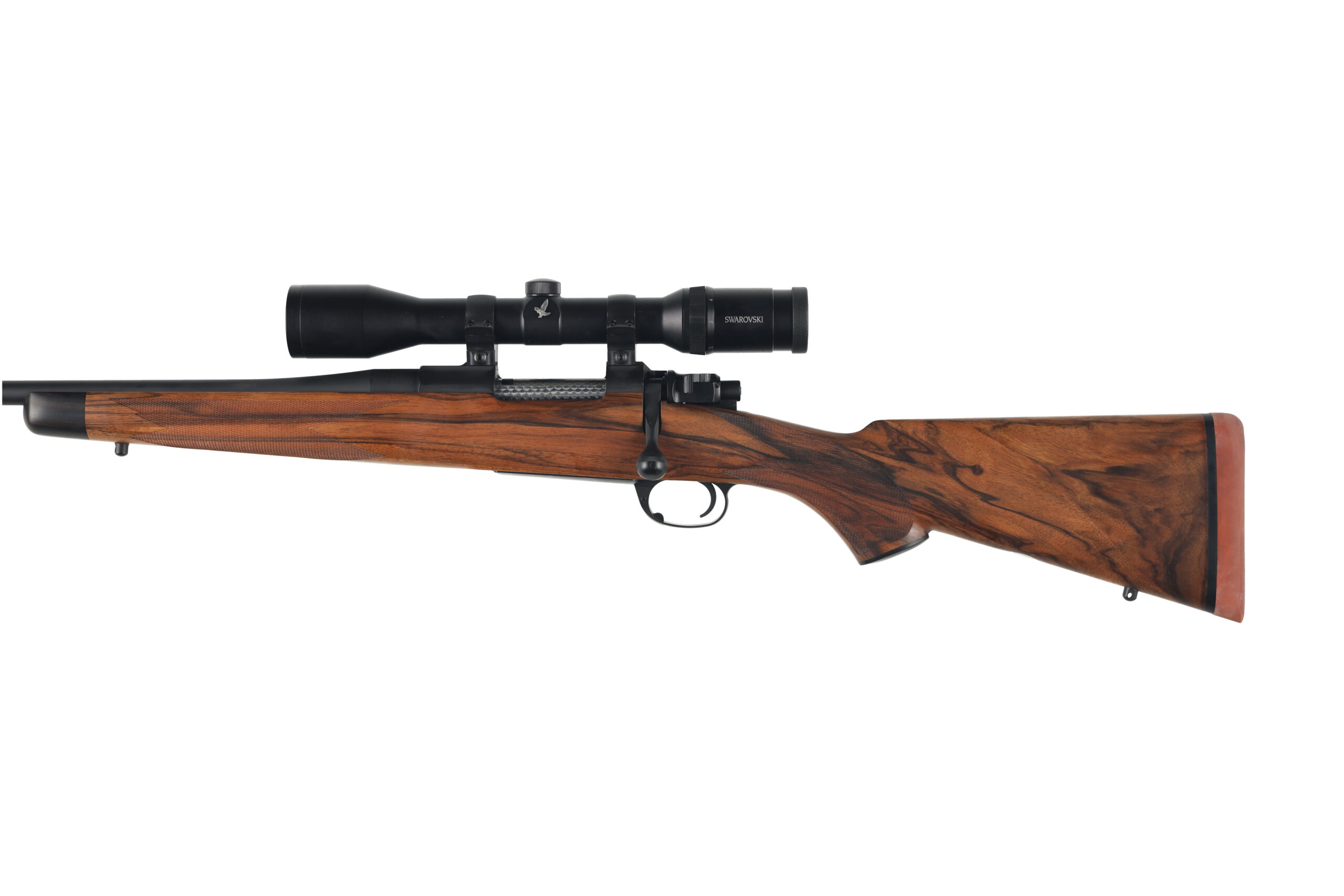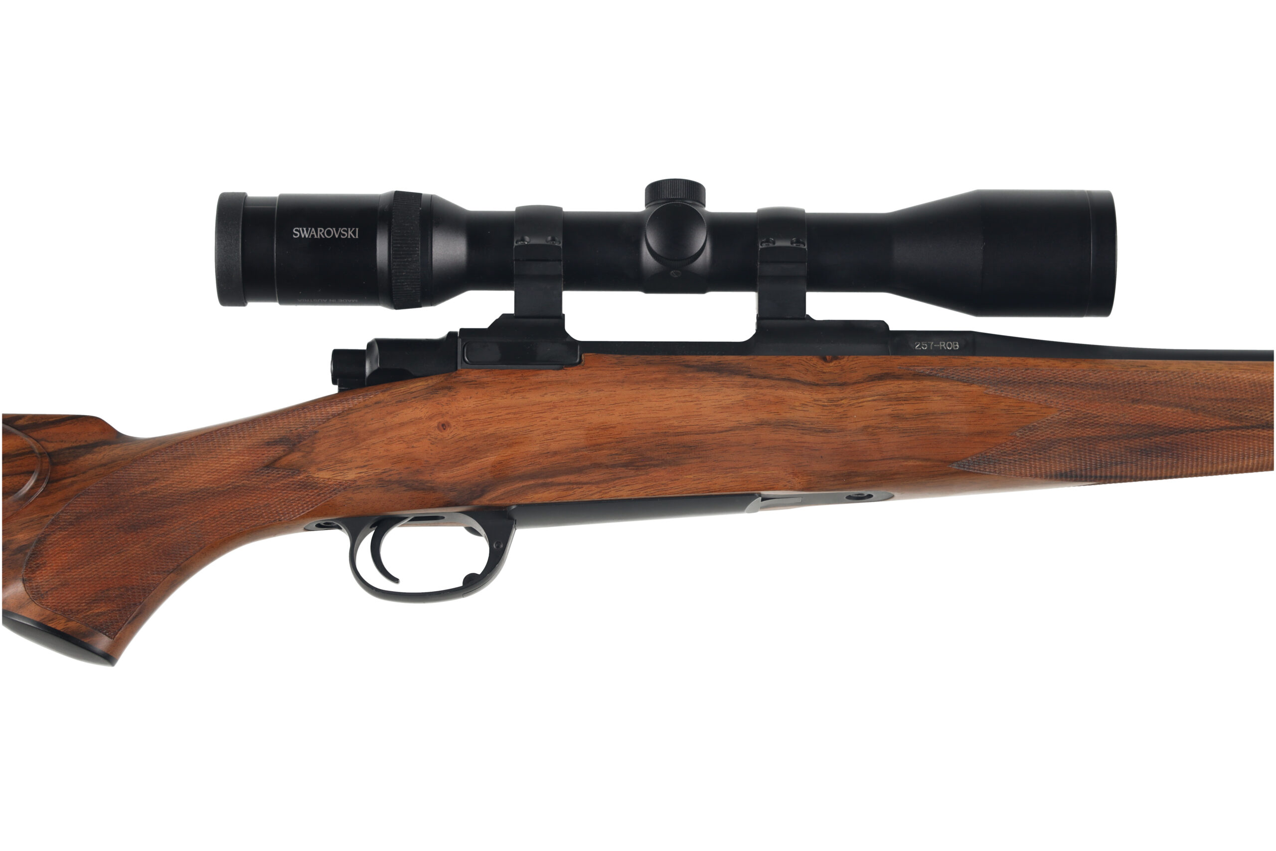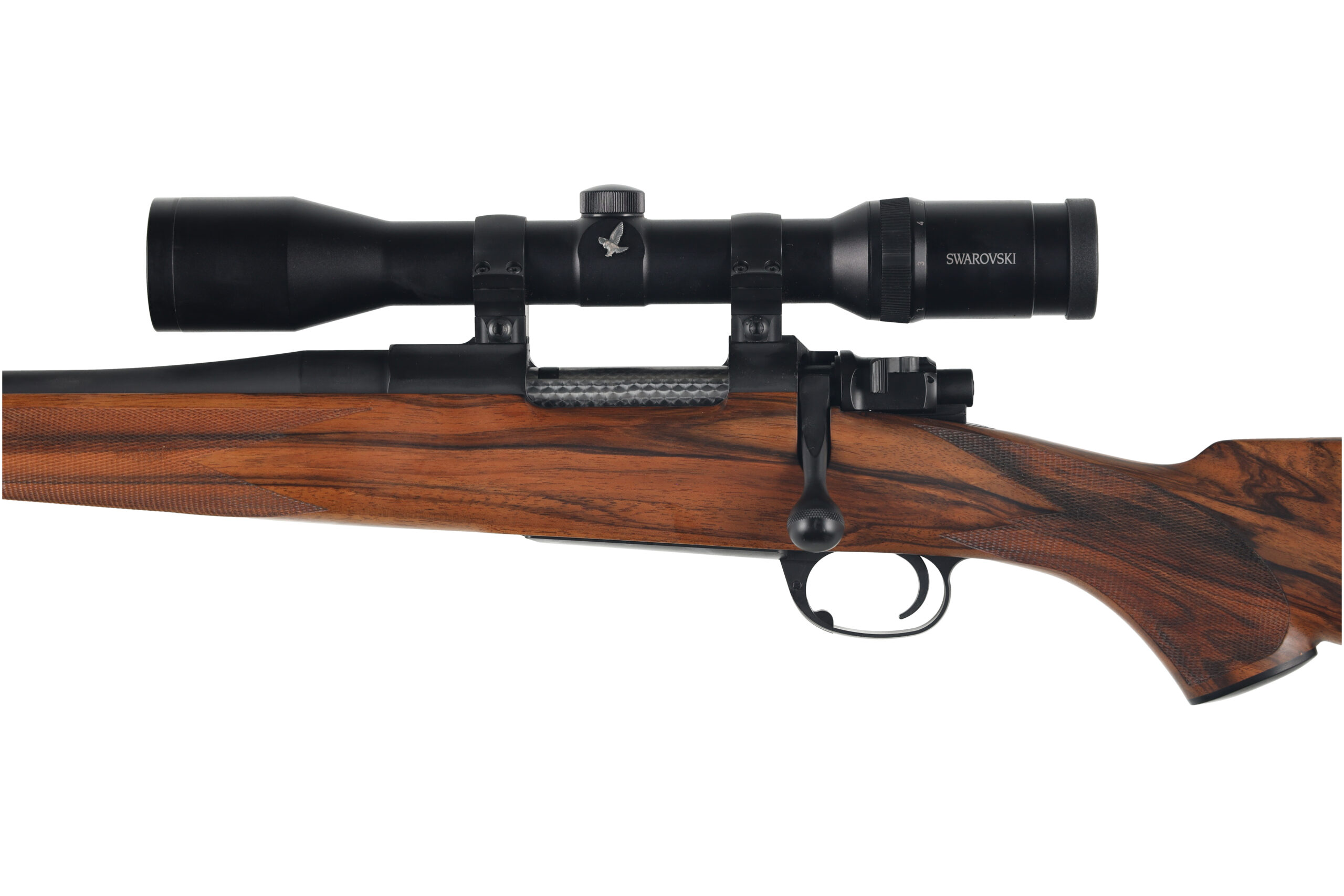 Empire Rifle Company was one of the very few American makers who tackled the project of the double square bridge Mauser action, a notably difficult action to manufacture. As a result their rifles were of very high quality and fetched a hefty price tag. This example appears to be one of their “Standard” Models, with its plain barrel, bereft of sights and relying solely on the dovetailed action for optics mounting. Condition of this used rifle is excellent, with practically no wear to be seen and an excellent Swarovski optic installed.