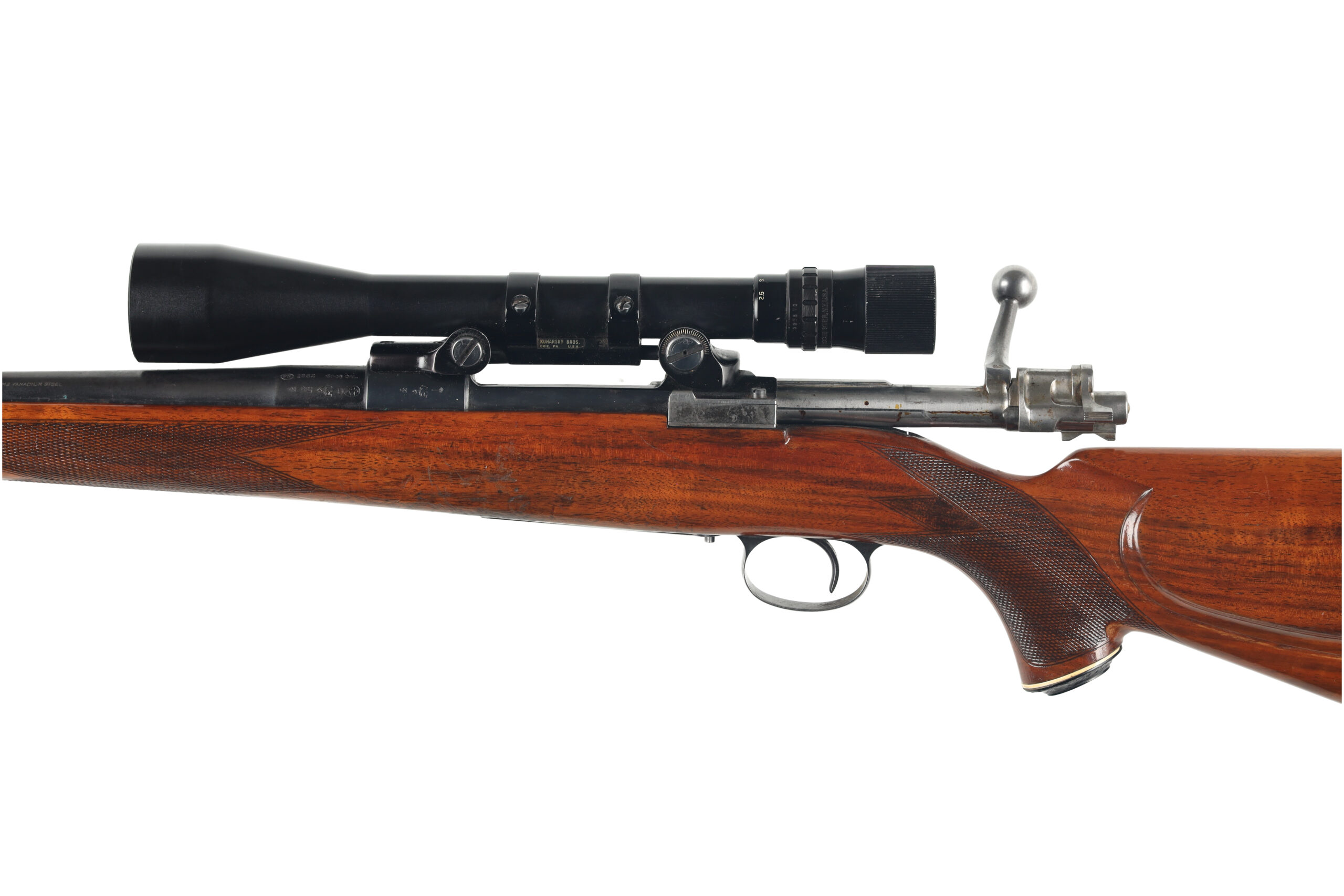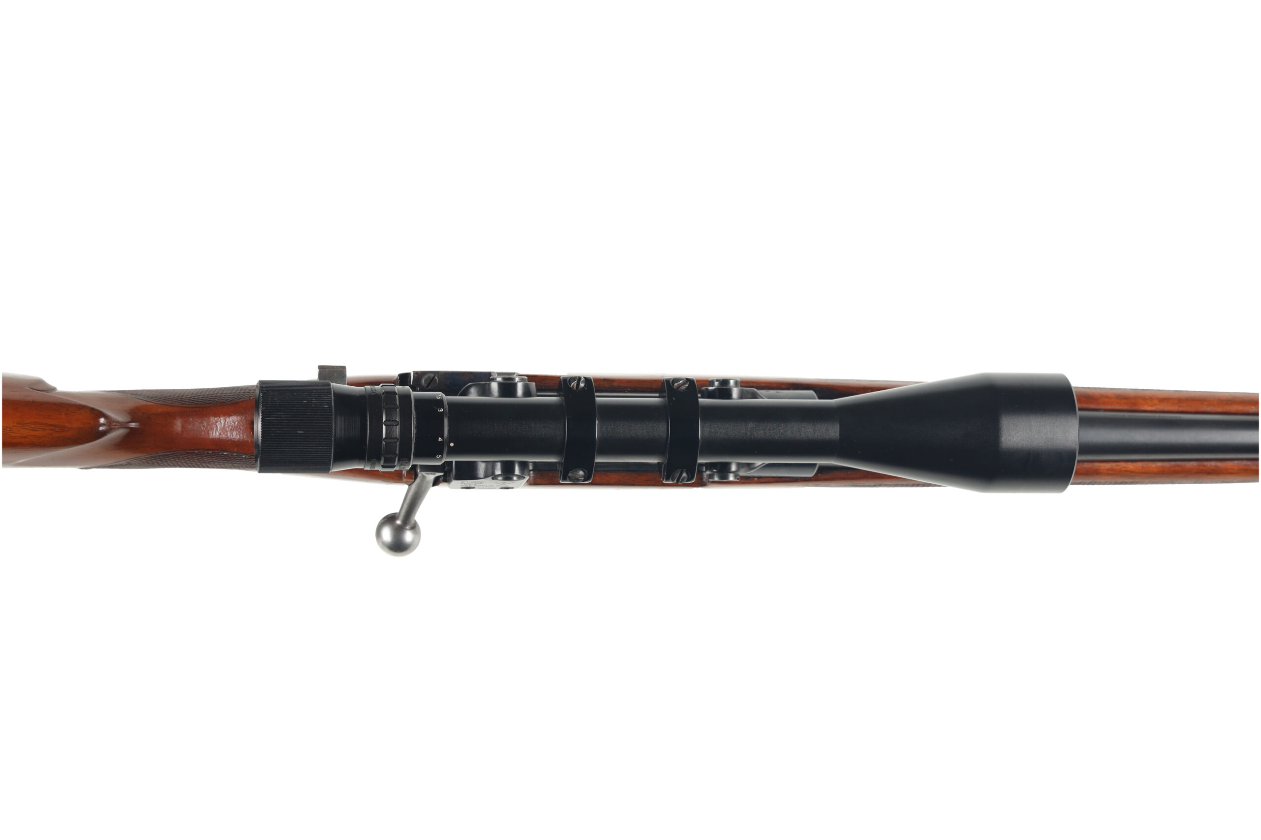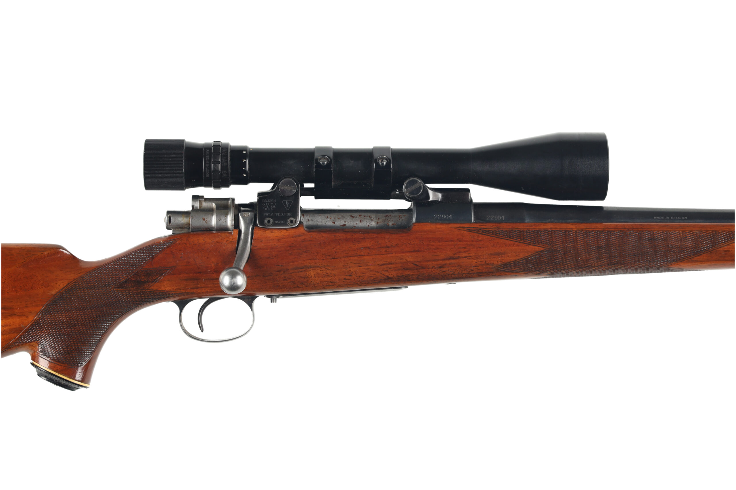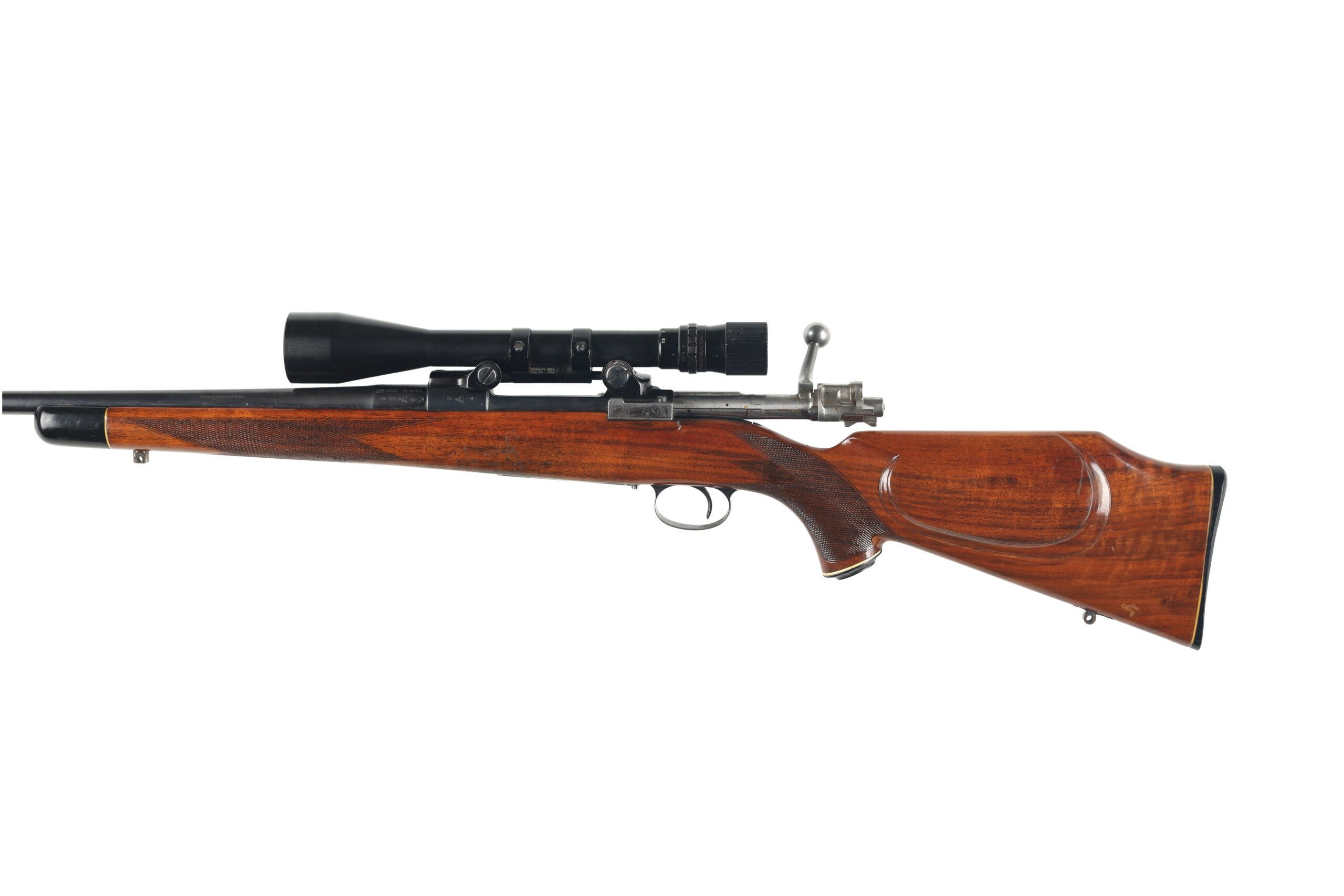This FN Mauser rifle in a Bishop stock is in good to very good overall condition, with moderate wear, bore condition is also good, with slight erosion. Comes with a Bausch & Lomb Balavar 8A optic installed.