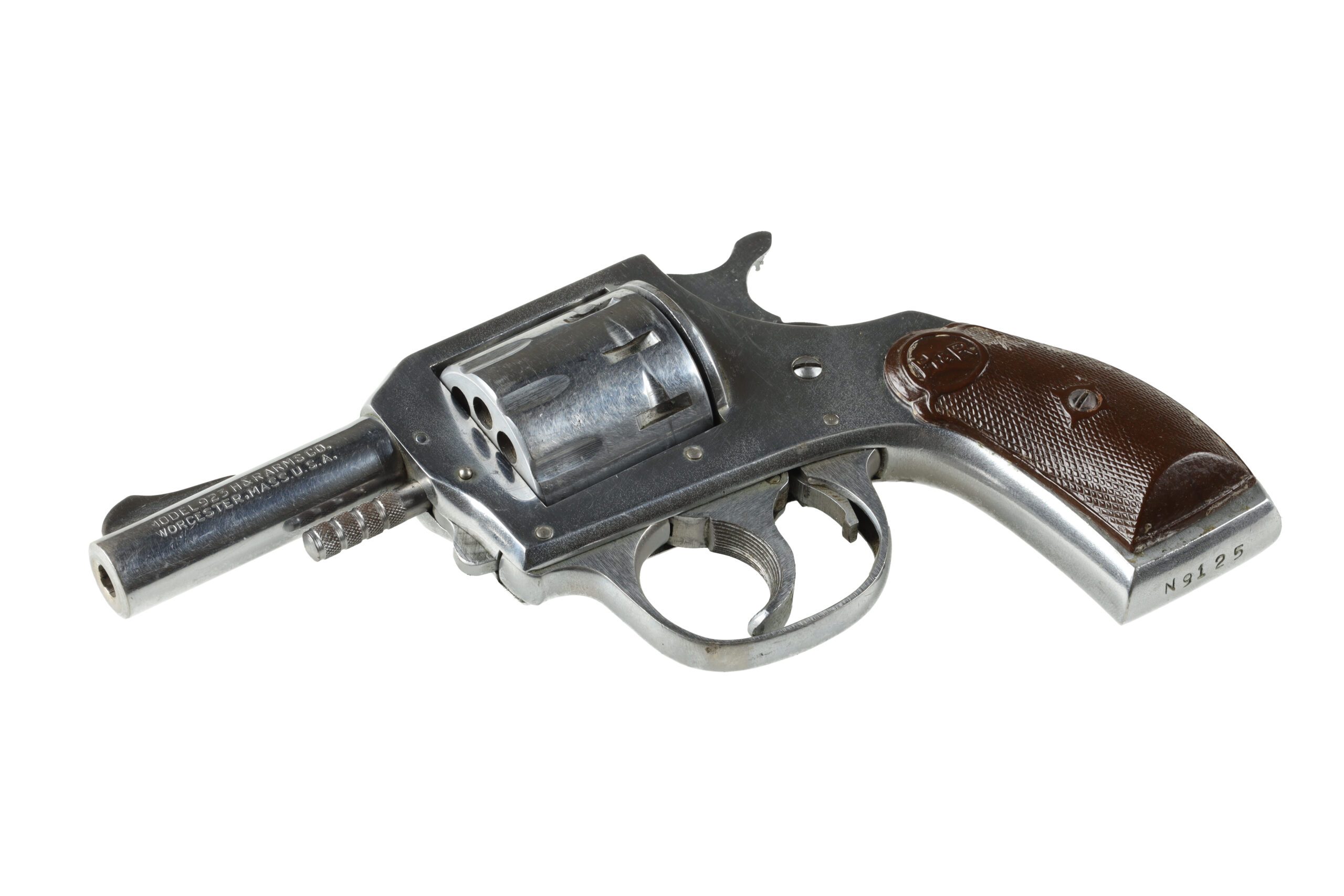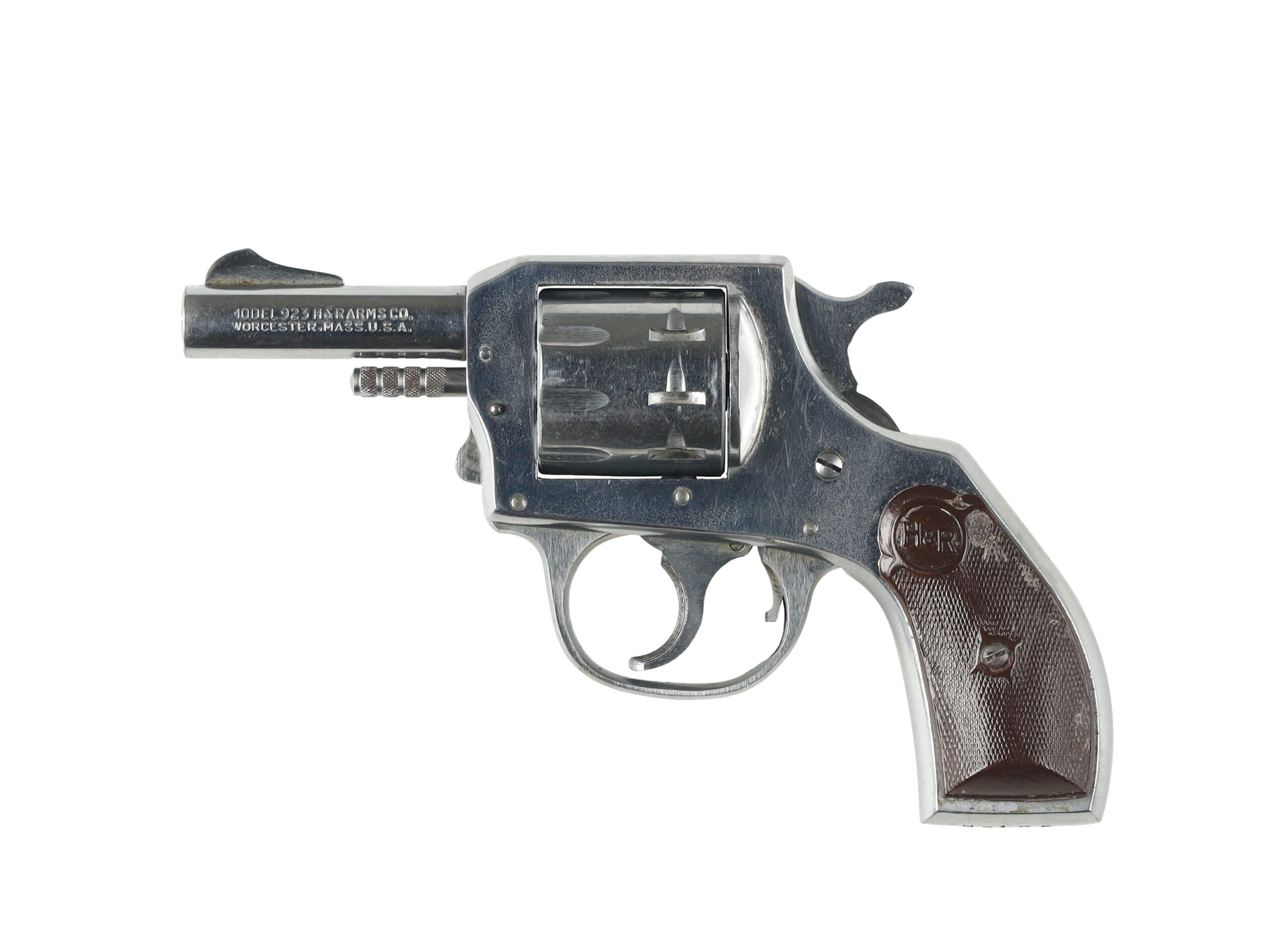 The H&R 923 was one of many .22 cal double action pistols made by the firm over the years, it is of fairly simple construction, making it quite reliable. Overall condition of this example is fair to good, with some flaking nickel finish and slightly shrunken plastic grips.