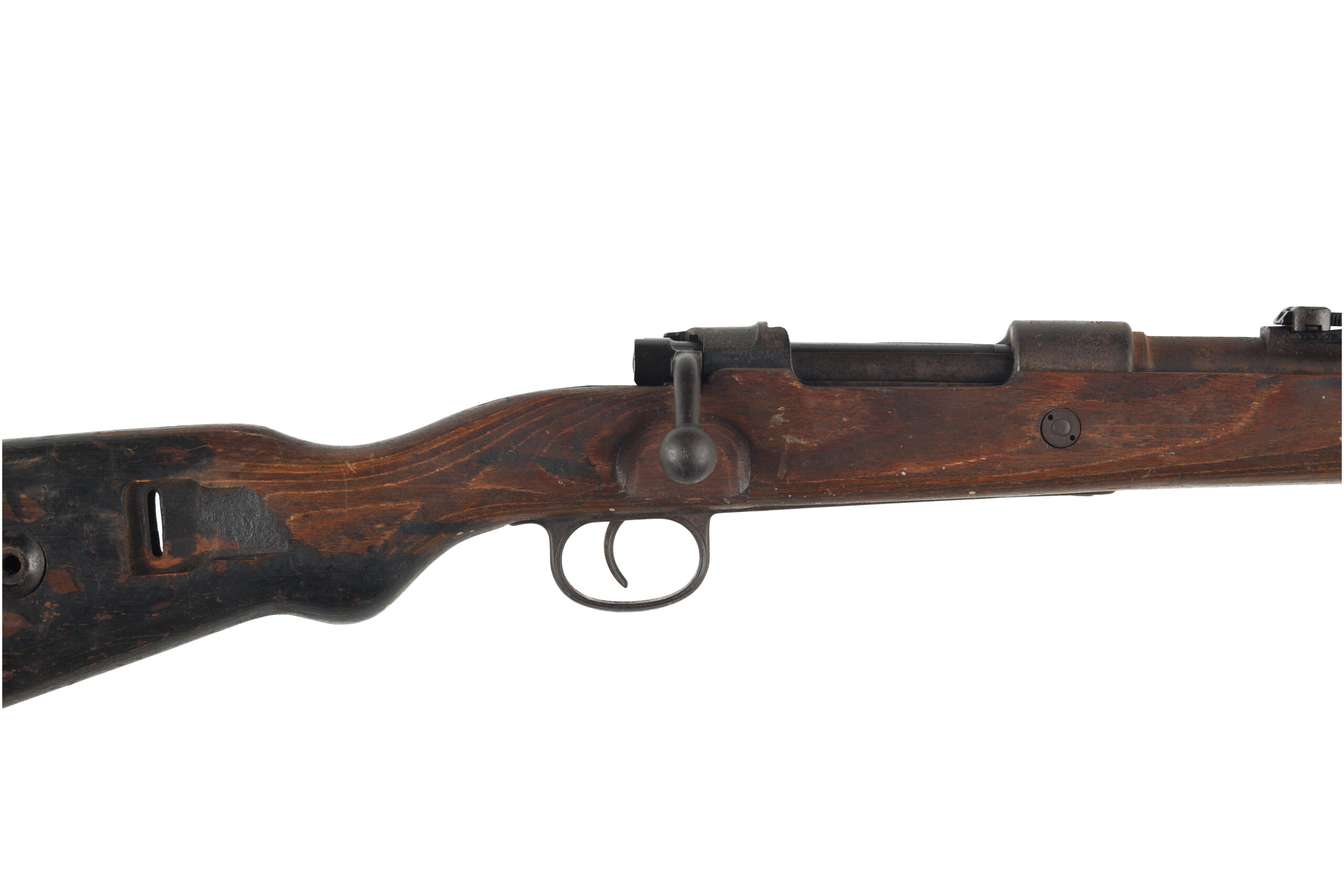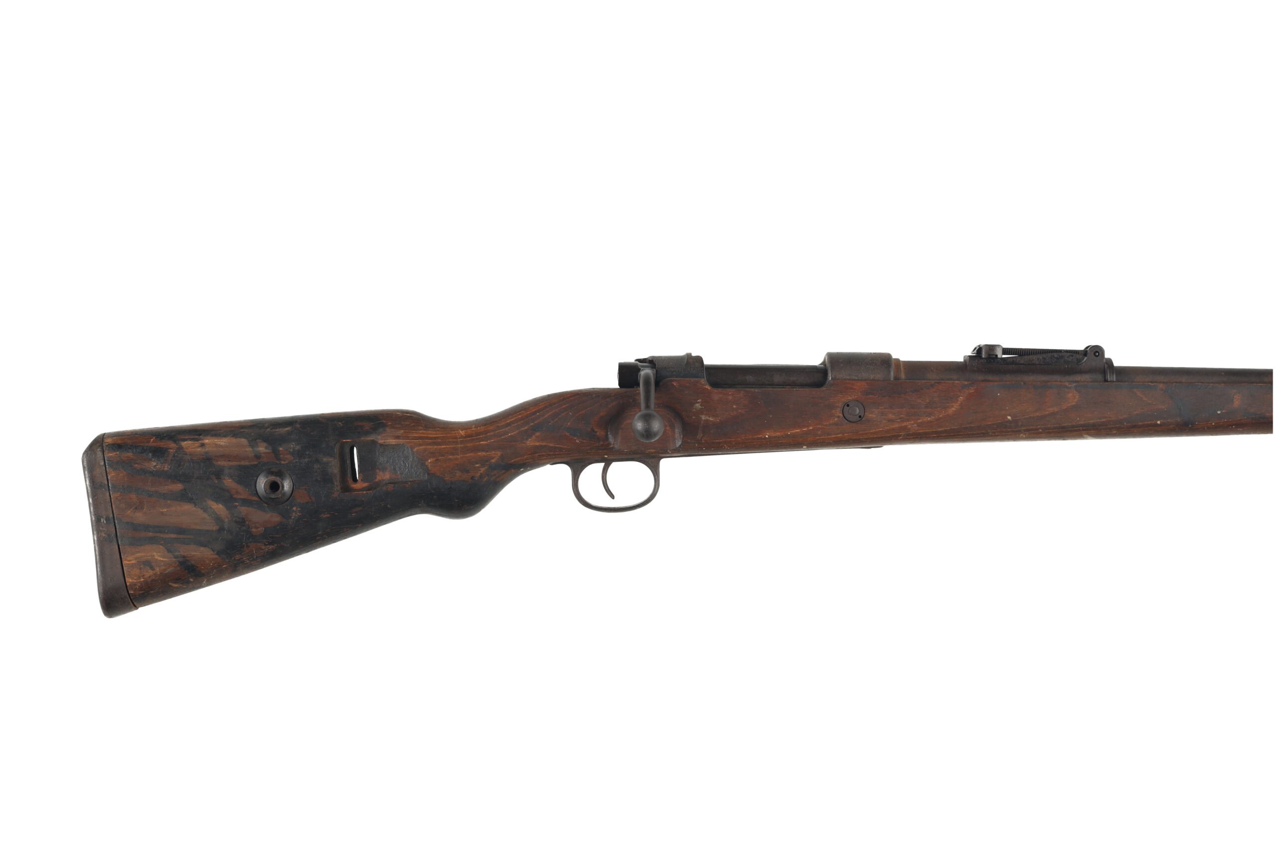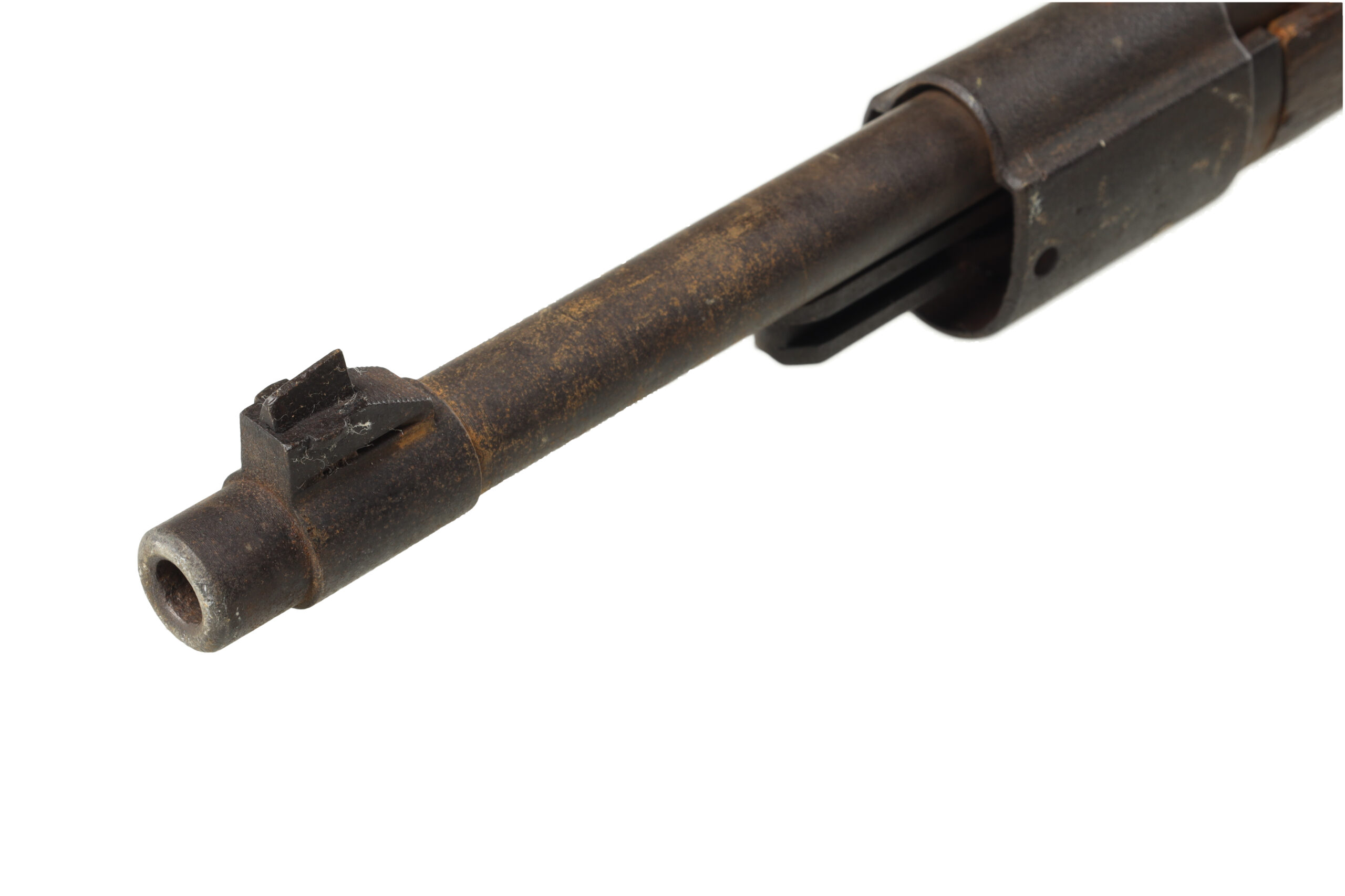 The Karabiner 98 kurz was the primary service rifle for the German military during World War 2, being supplemented by semi automatic rifles and machine guns. This example is marked CE 44, the marking for J.P. Sauer for wartime production. Overall condition is somewhat poor, but without any deep pits anywhere but inside the bore. It is unfortunately missing many parts, as it was likely used as a parts gun, however all of the remaining parts are numbers matching. Due to the numbers matching nature and the consistent shallow corrosion, this rifle would be a good candidate for restoration if one wishes to put in the time. Alternatively if one wishes this to be an action doner, keep in mind that the barrel is the only location that bears the rifle’s serial number.