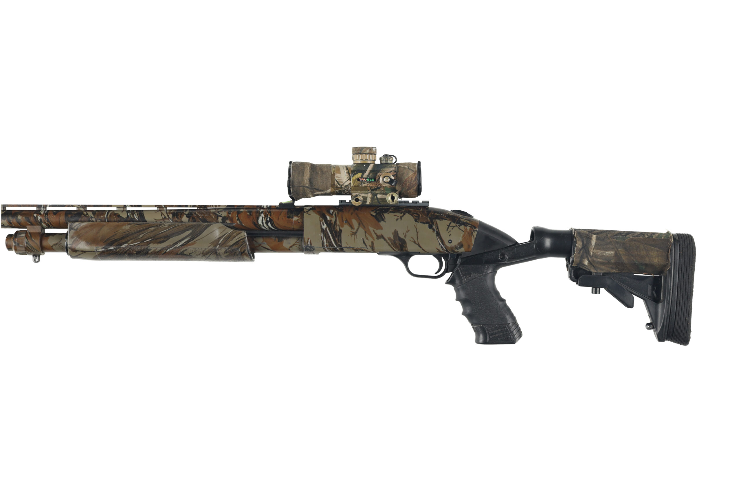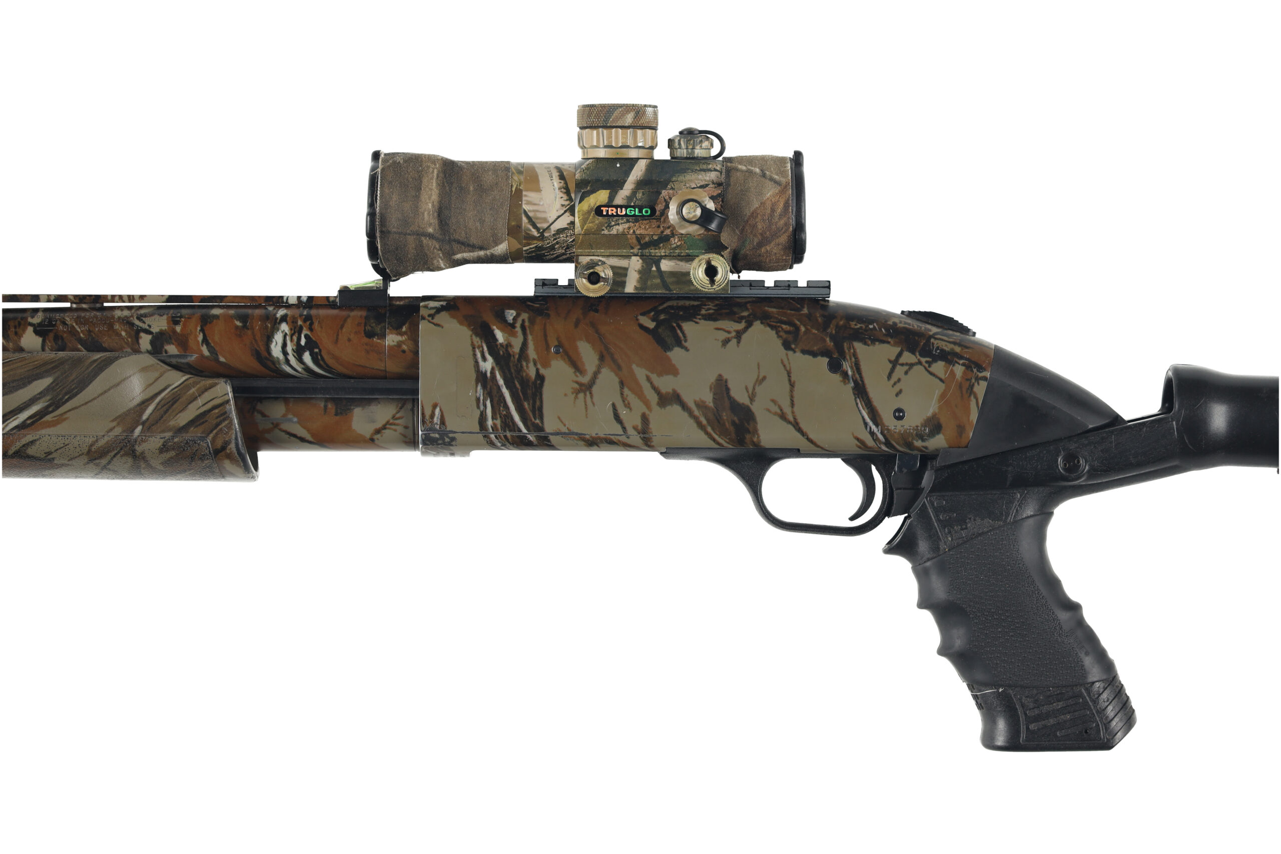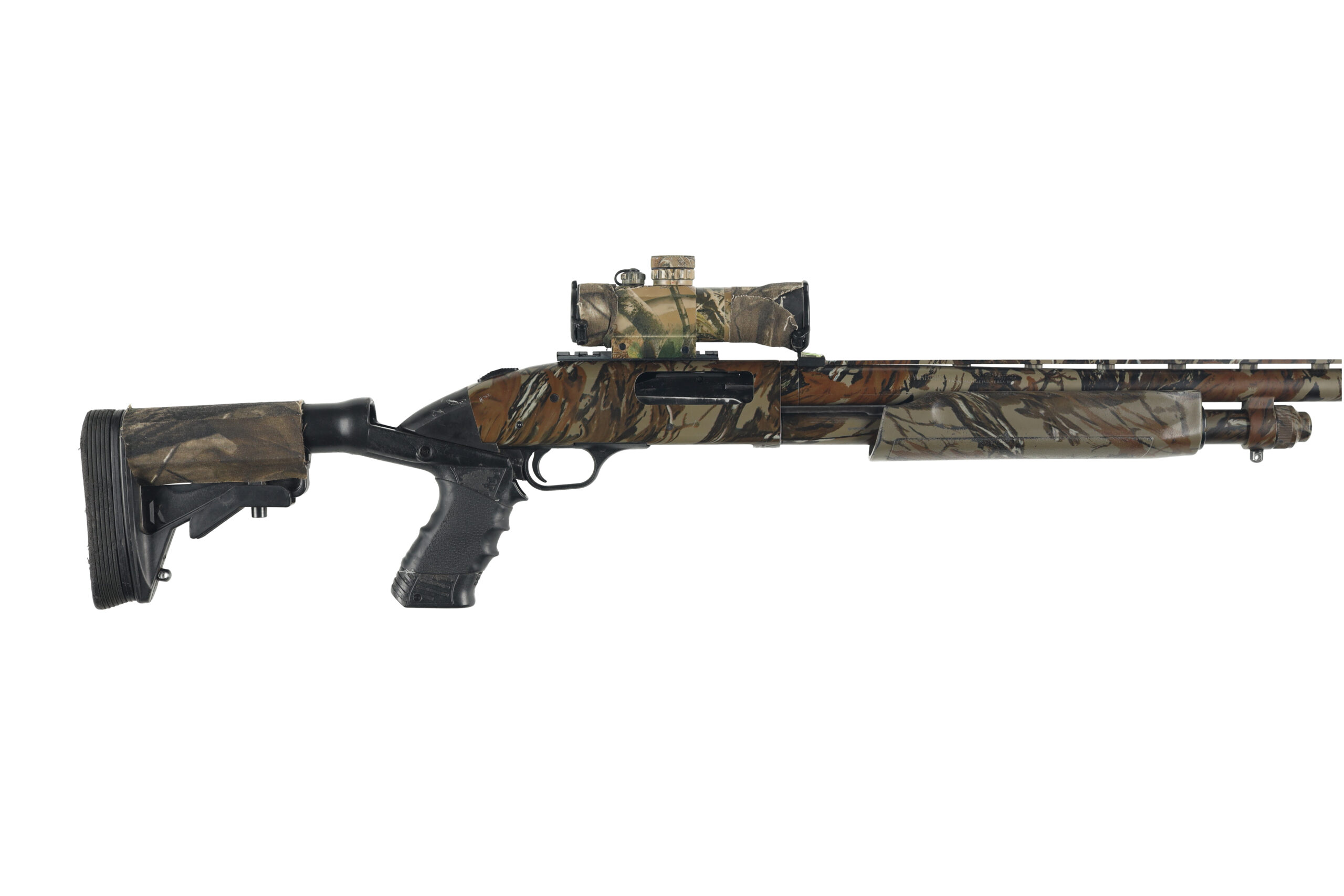 The Mossberg 835 ULTI-MAG is one of the first shotguns developed specifically for 3.5″ shotshells and with its barrels backbored to nearly 10 Gauge, it gives better shot patterns with reduced recoil impulse compared to similar shotgun models. This example of a turkey variant has been upgraded with a Spec Ops Knoxx recoil reducing stock, Truglo red dot sight, and Jeb’s Headhunter turkey choke as well as a few other small addons. Overall condition is good, with moderate wear and the liberal addition of camouflage tape.