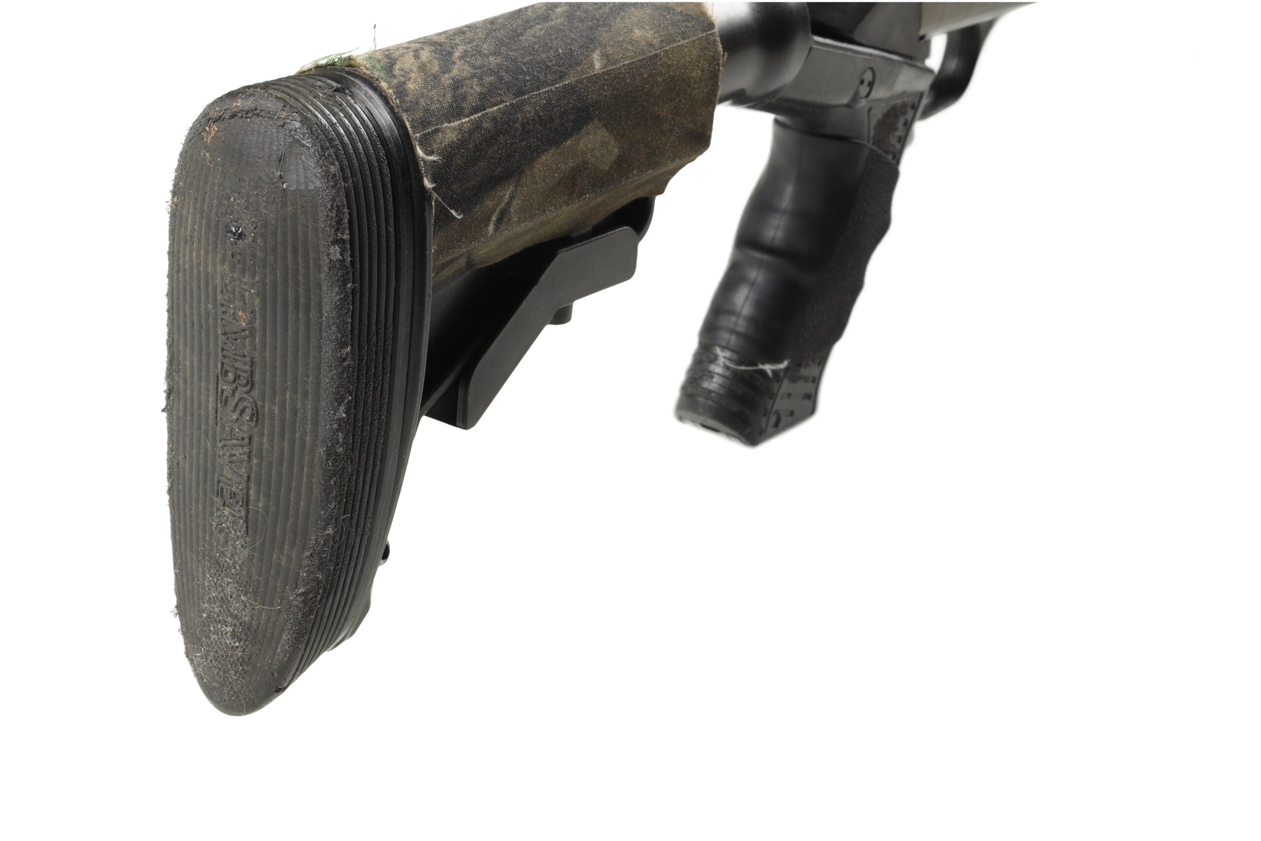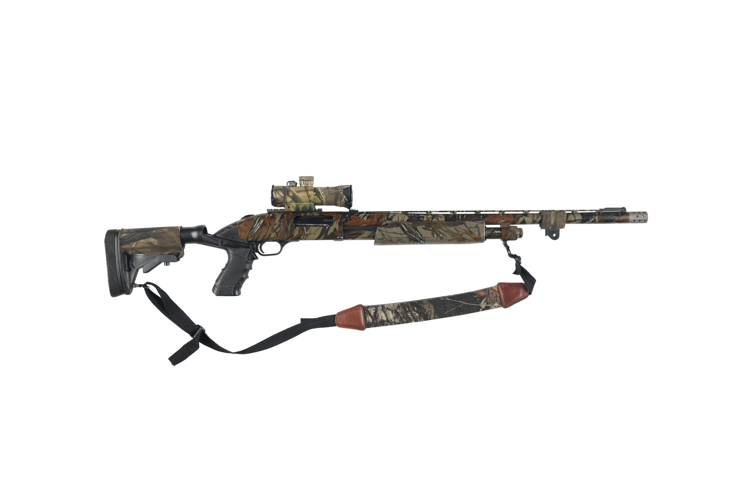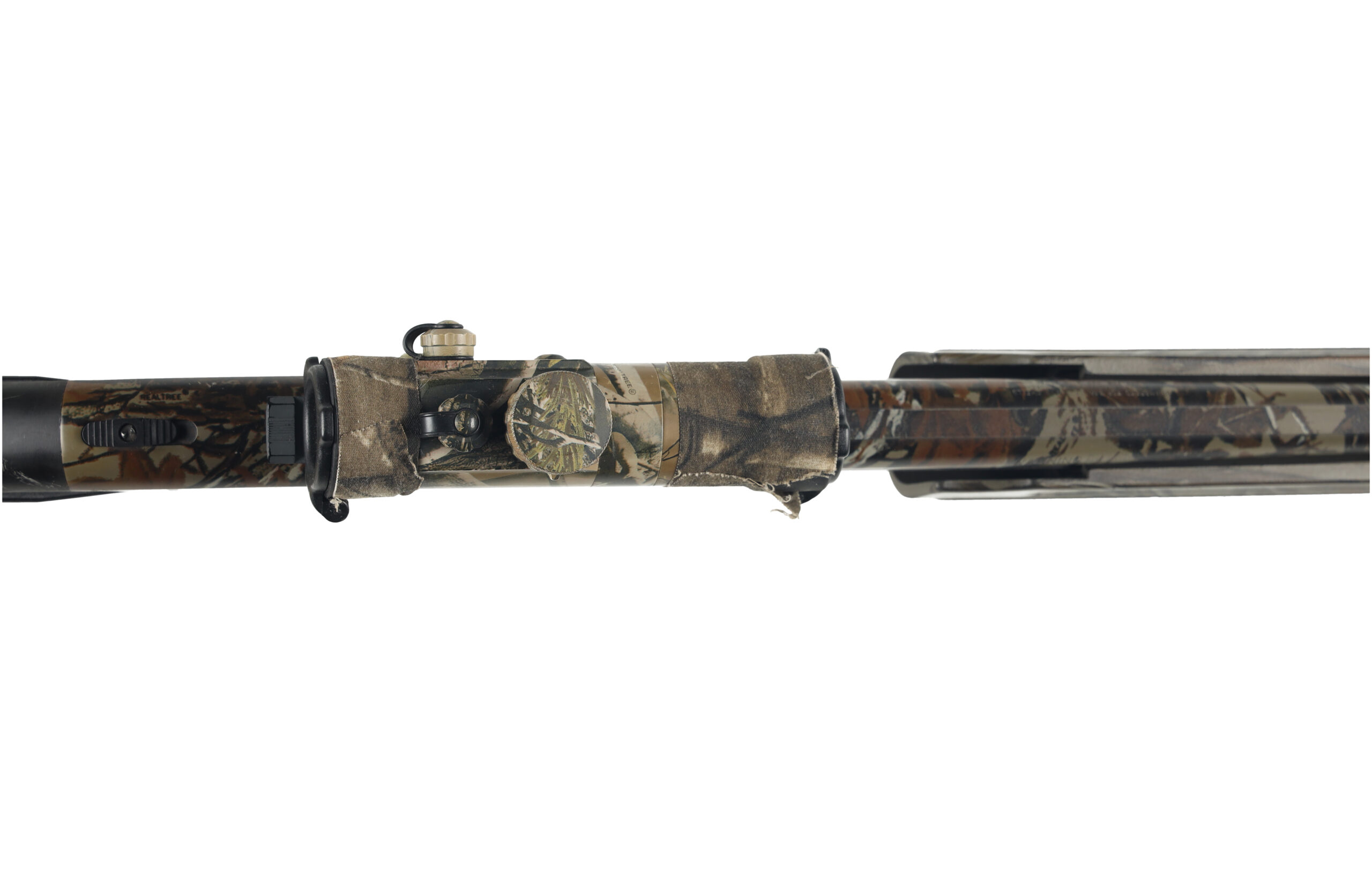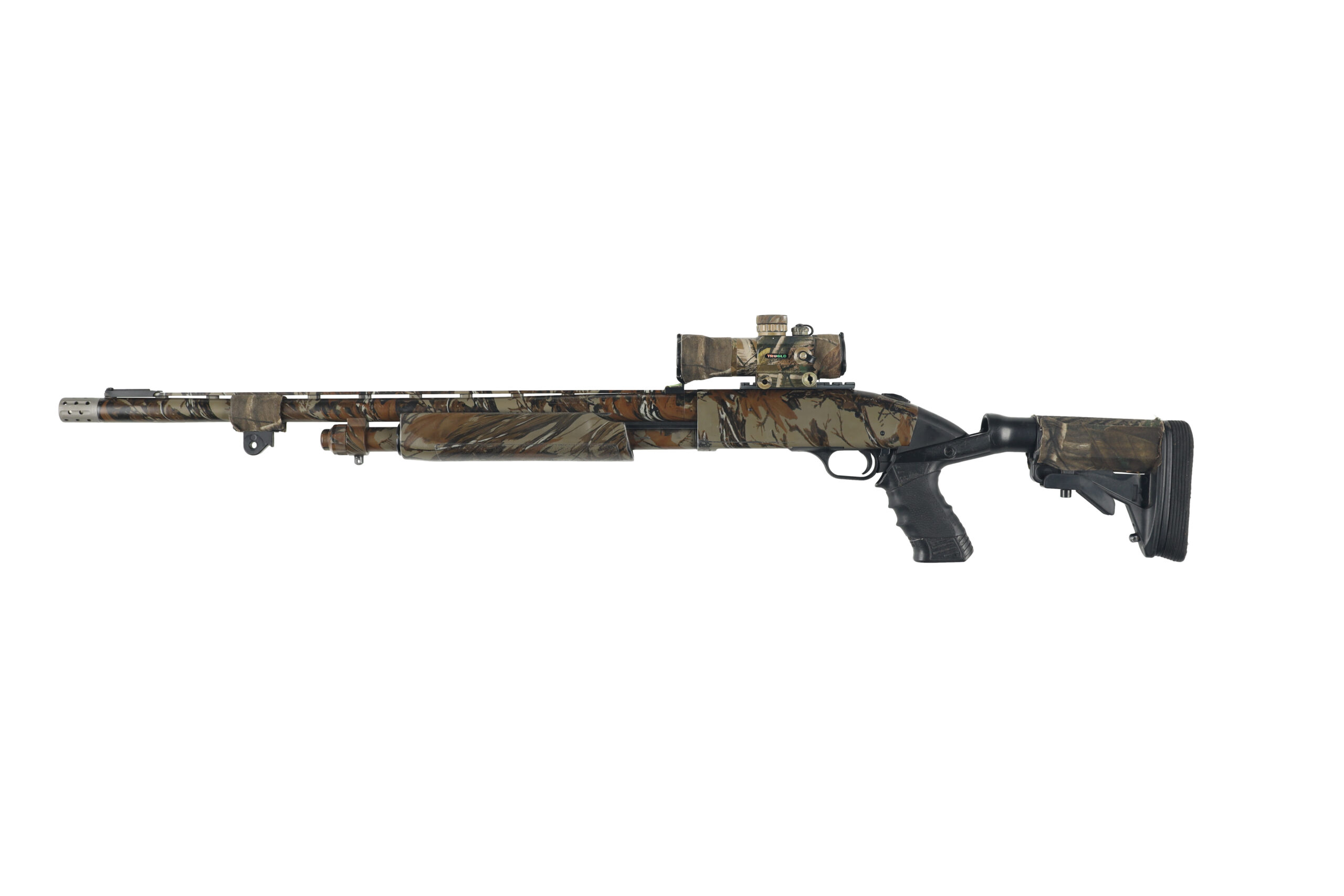 The Mossberg 835 ULTI-MAG is one of the first shotguns developed specifically for 3.5″ shotshells and with its barrels backbored to nearly 10 Gauge, it gives better shot patterns with reduced recoil impulse compared to similar shotgun models. This example of a turkey variant has been upgraded with a Spec Ops Knoxx recoil reducing stock, Truglo red dot sight, and Jeb’s Headhunter turkey choke as well as a few other small addons. Overall condition is good, with moderate wear and the liberal addition of camouflage tape.