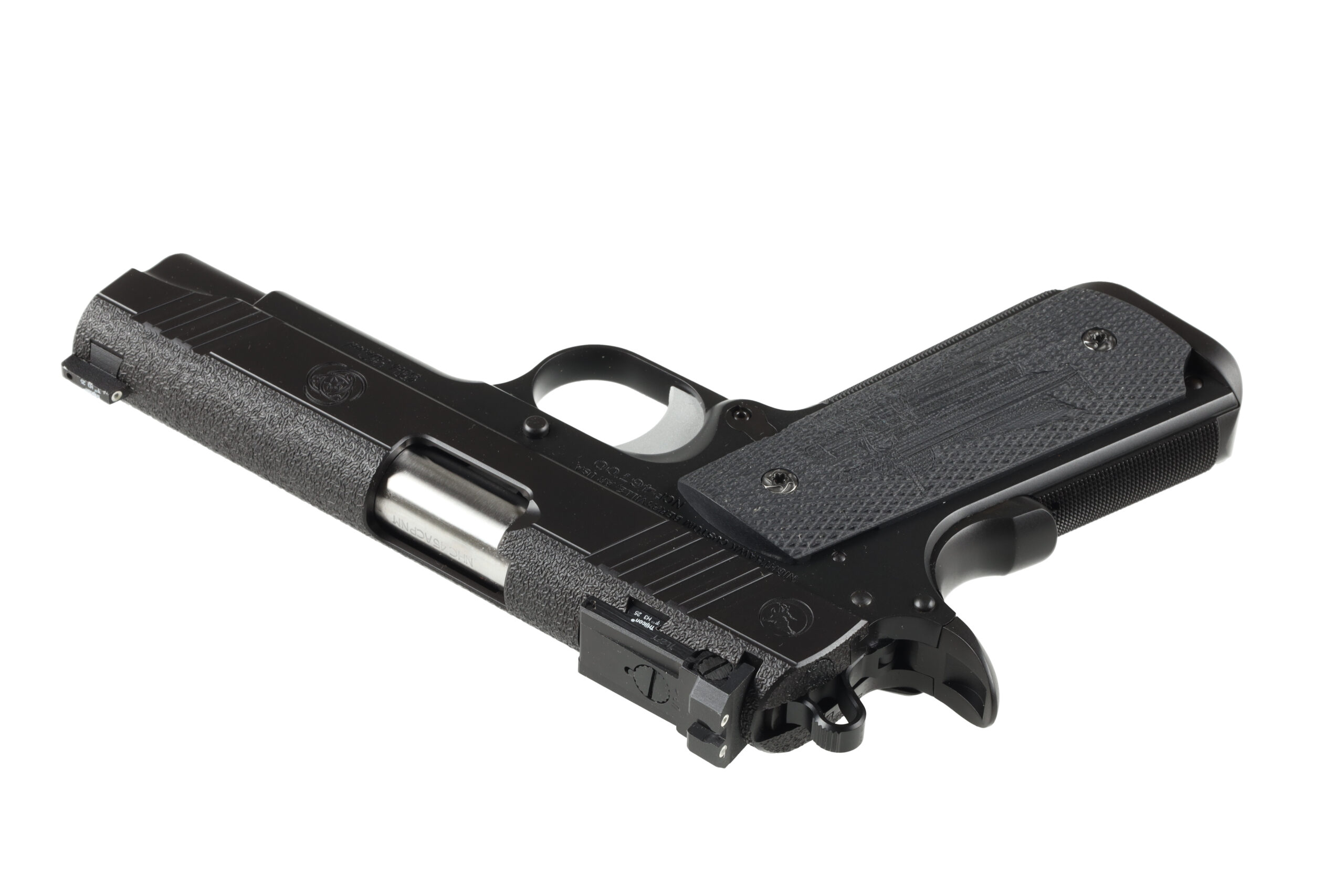 The Nighthawk Custom Bob Marvel is a testament to innovation and superior craftsmanship, standing out in the Nighthawk lineup with its multiple unique features. This commander-sized 1911 combines a stroked slide and frame, a bull barrel, and an Everlast Recoil System to deliver unmatched accuracy, reliability, and reduced recoil. These enhancements make the Bob Marvel more efficient and pleasurable to shoot than a standard commander pistol.