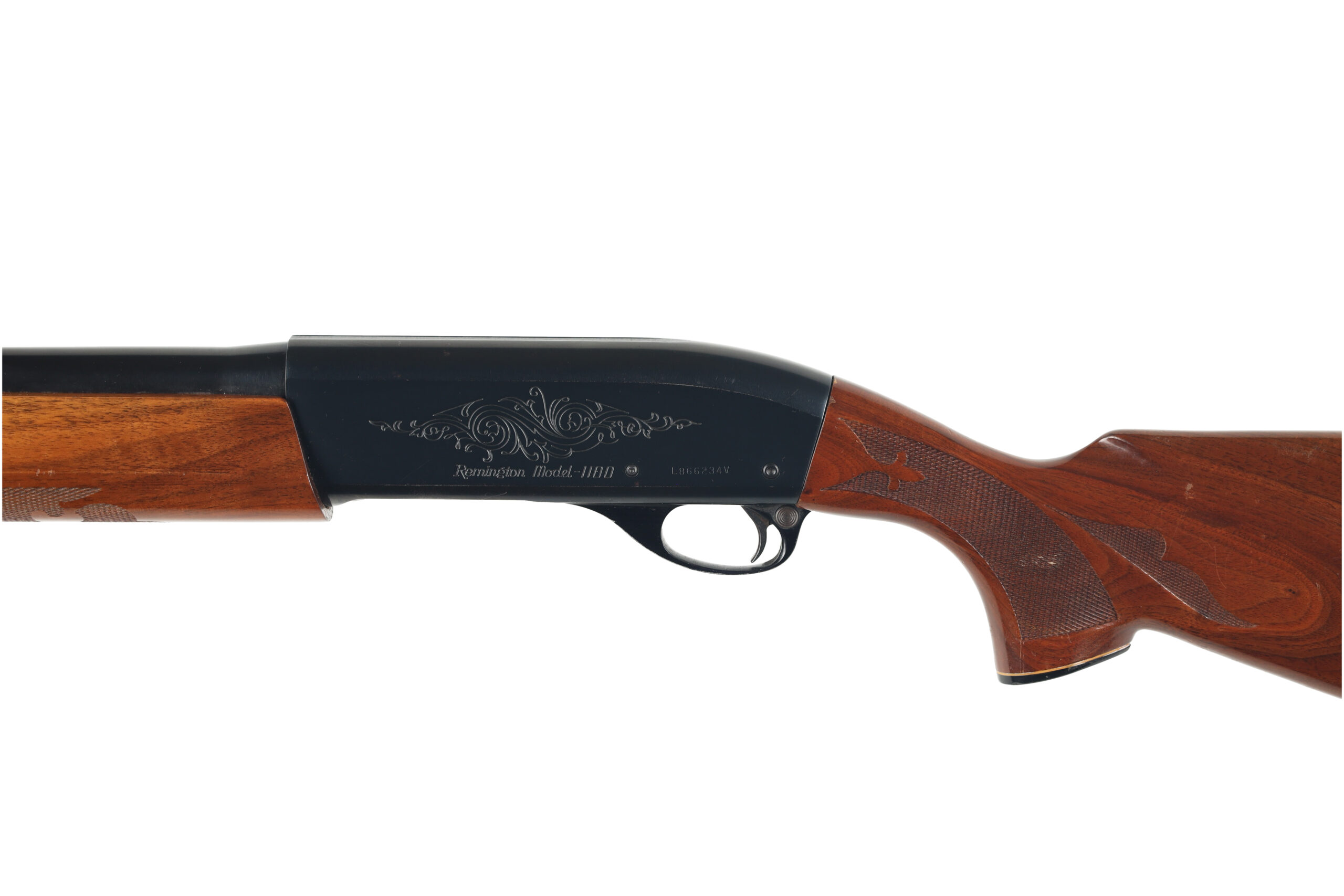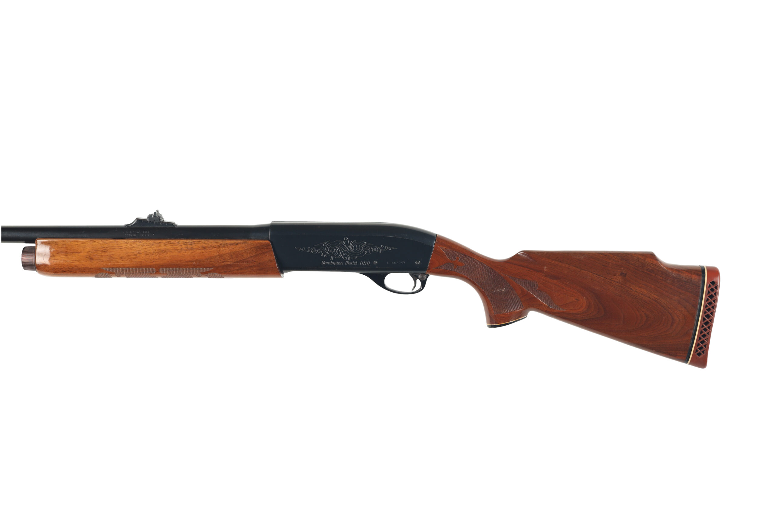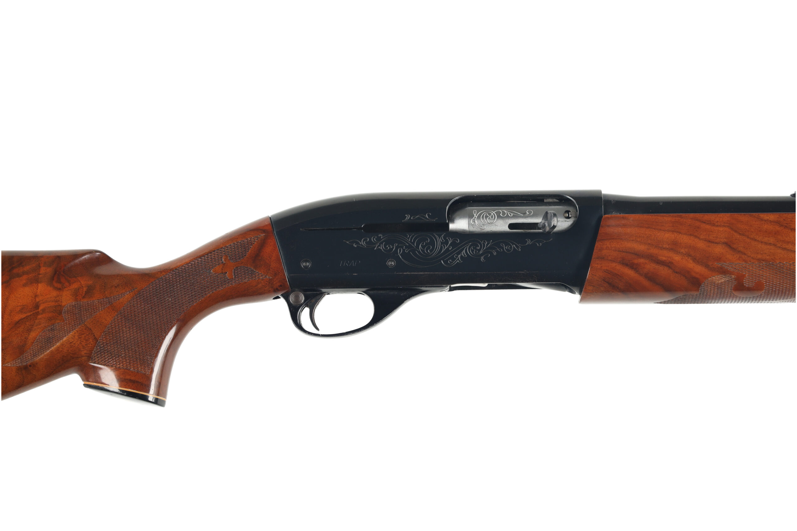 The Remington Model 1100 is one of the most popular semi automatic shotguns in the U.S.A with over 4 million sold. This used example, with a Trap marked receiver and a buck barrel, is in very good overall condition, with little wear but a few scattered spots of corrosion on the steel parts.