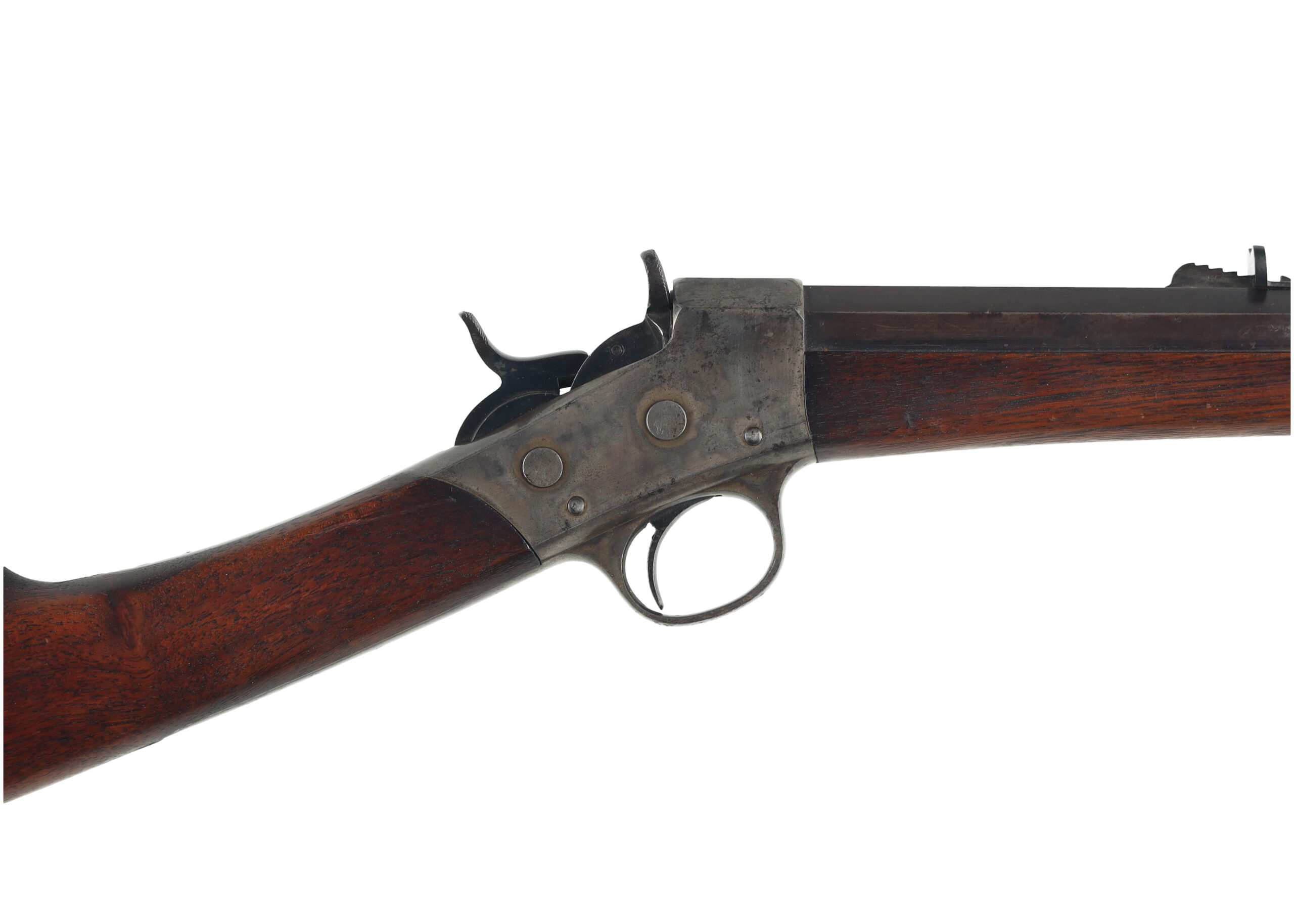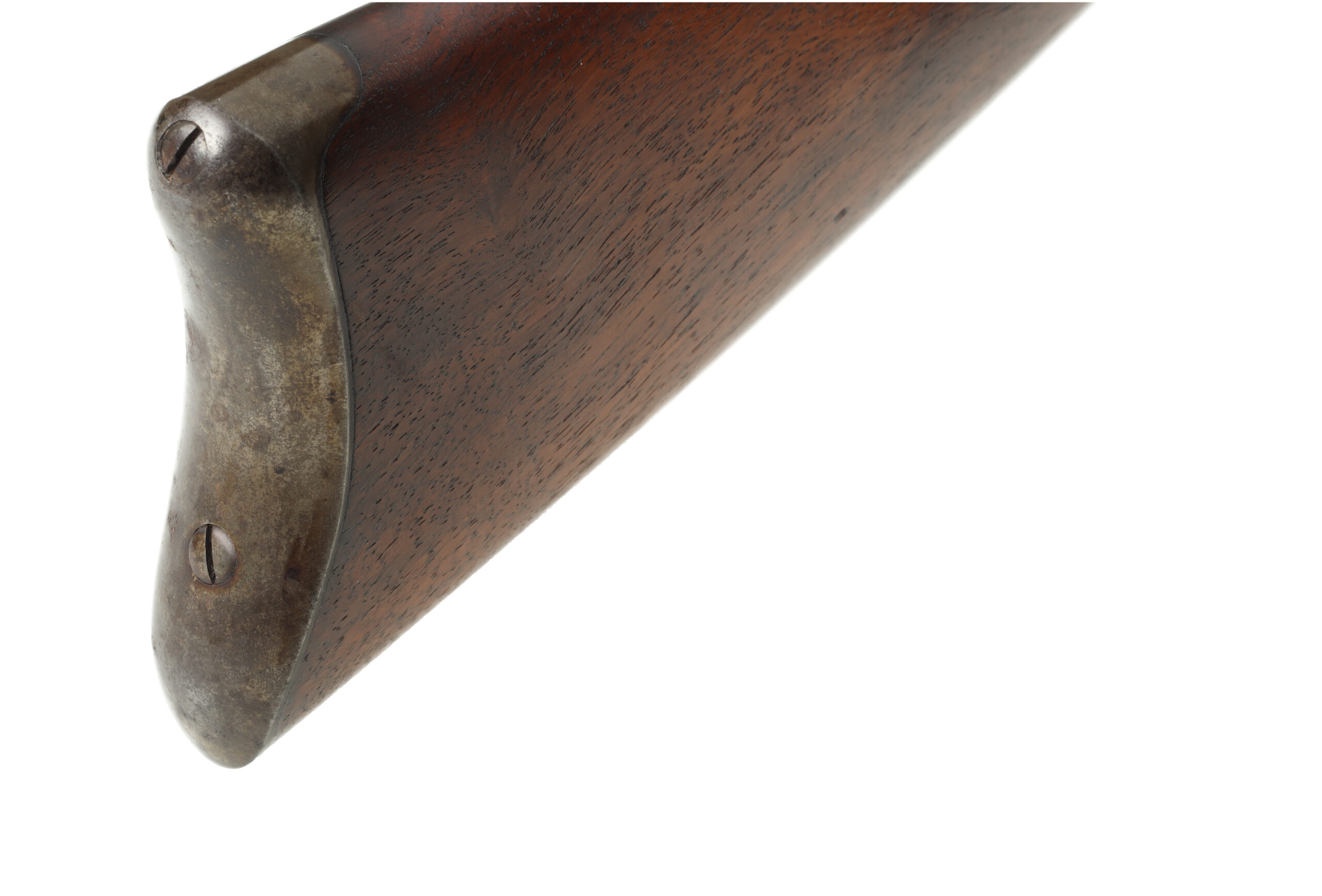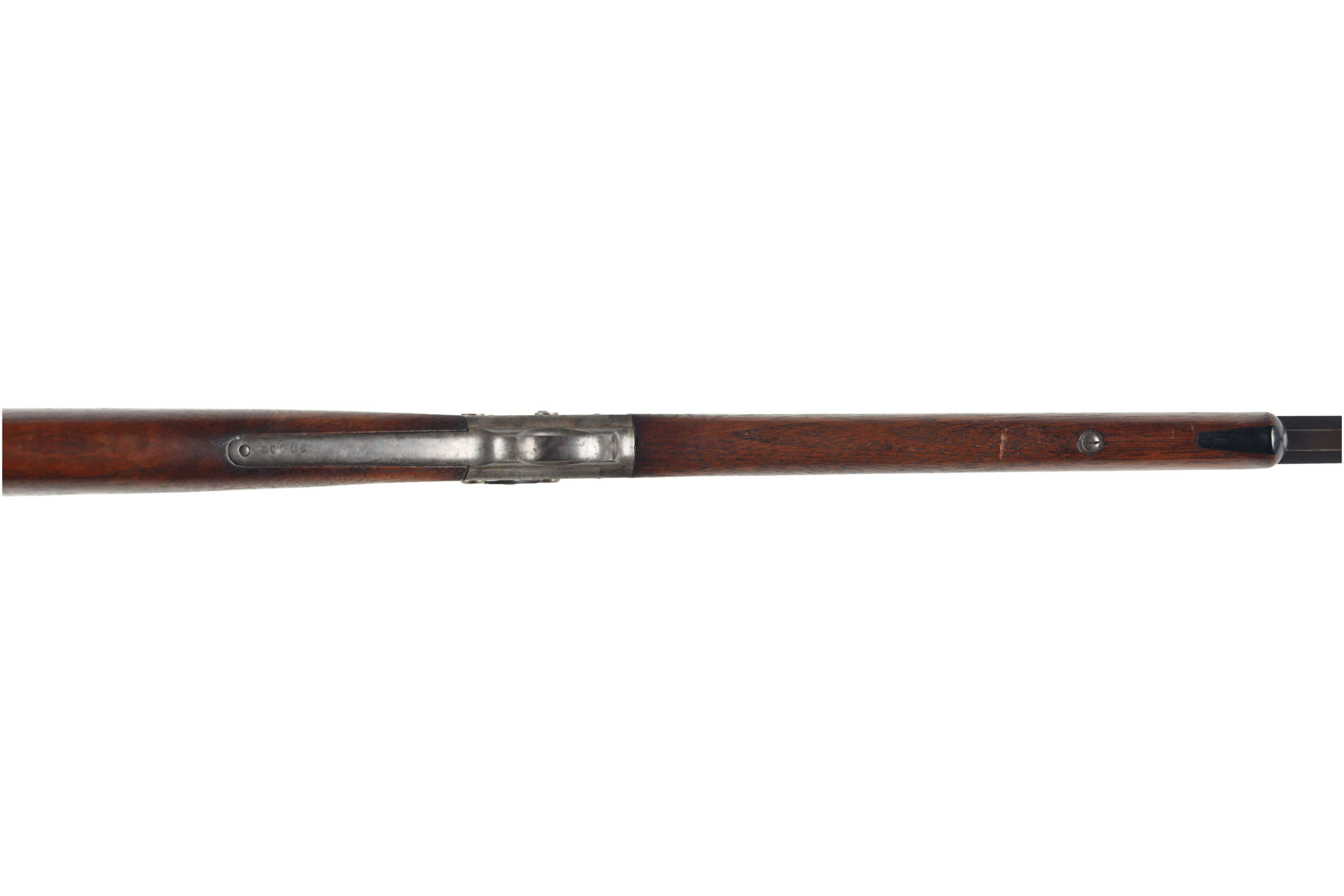 The Remington Model 2 Rolling block sporting rifle was manufactured from roughly 1873 until 1910 and was offered in a variety of cartridges, ranging from .22 to .38 in diameter. Overall condition of this example, chambered in .22 short, is very good, with the most notable of wear being inside the bore, which has pitted somewhat near the muzzle. The stock has also started cracking at the rear of the tangs.