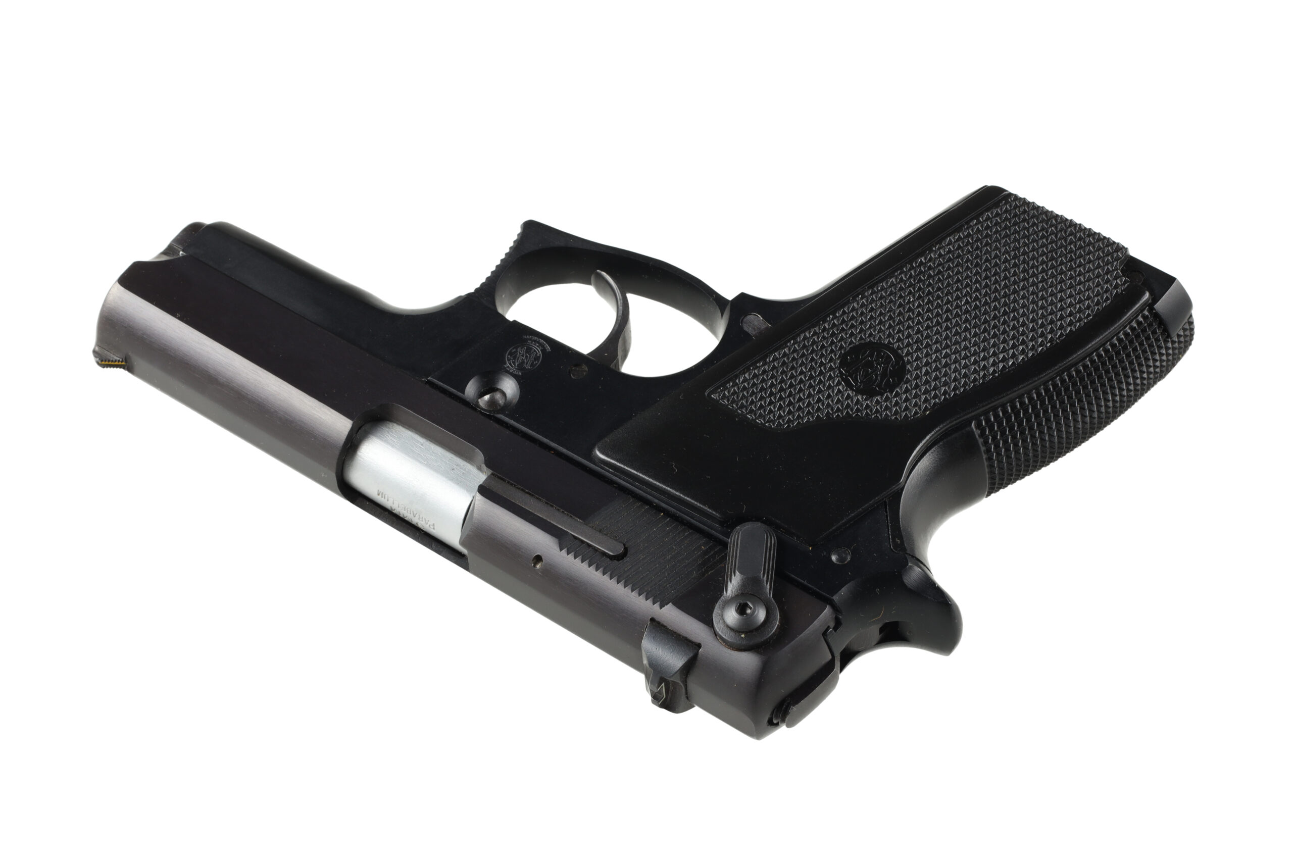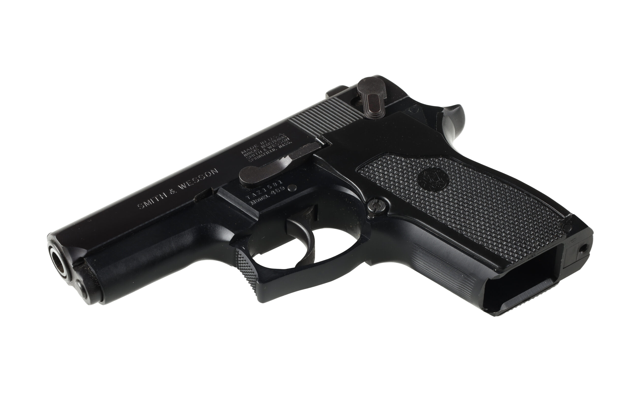 The Smith & Wesson 469 is an early pistol in the 59 series of pistols, designed to be easily concealable but have enough magazine capacity to be used as a duty pistol. This example is in excellent overall condition, looking to have never been used or perhaps very little.
