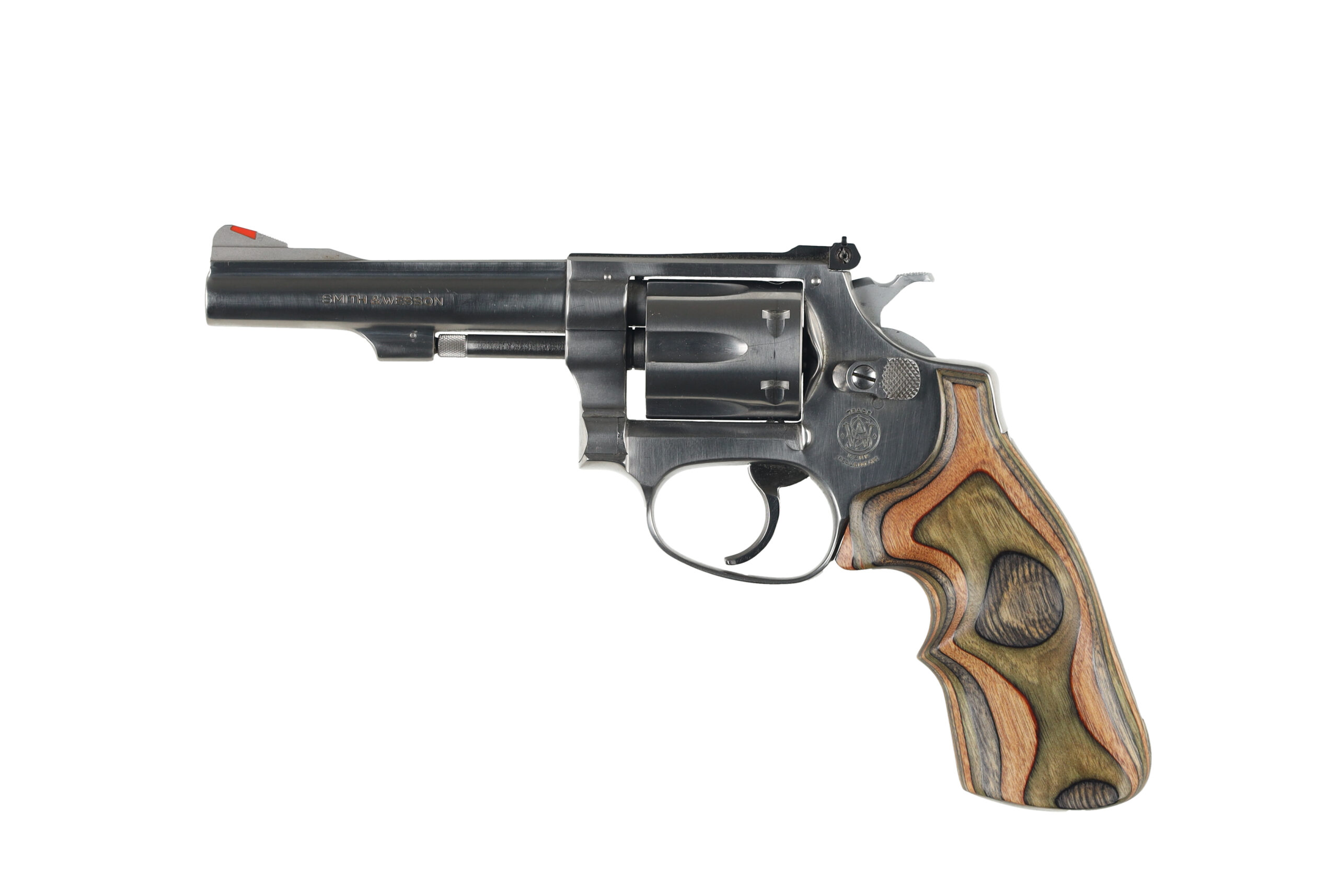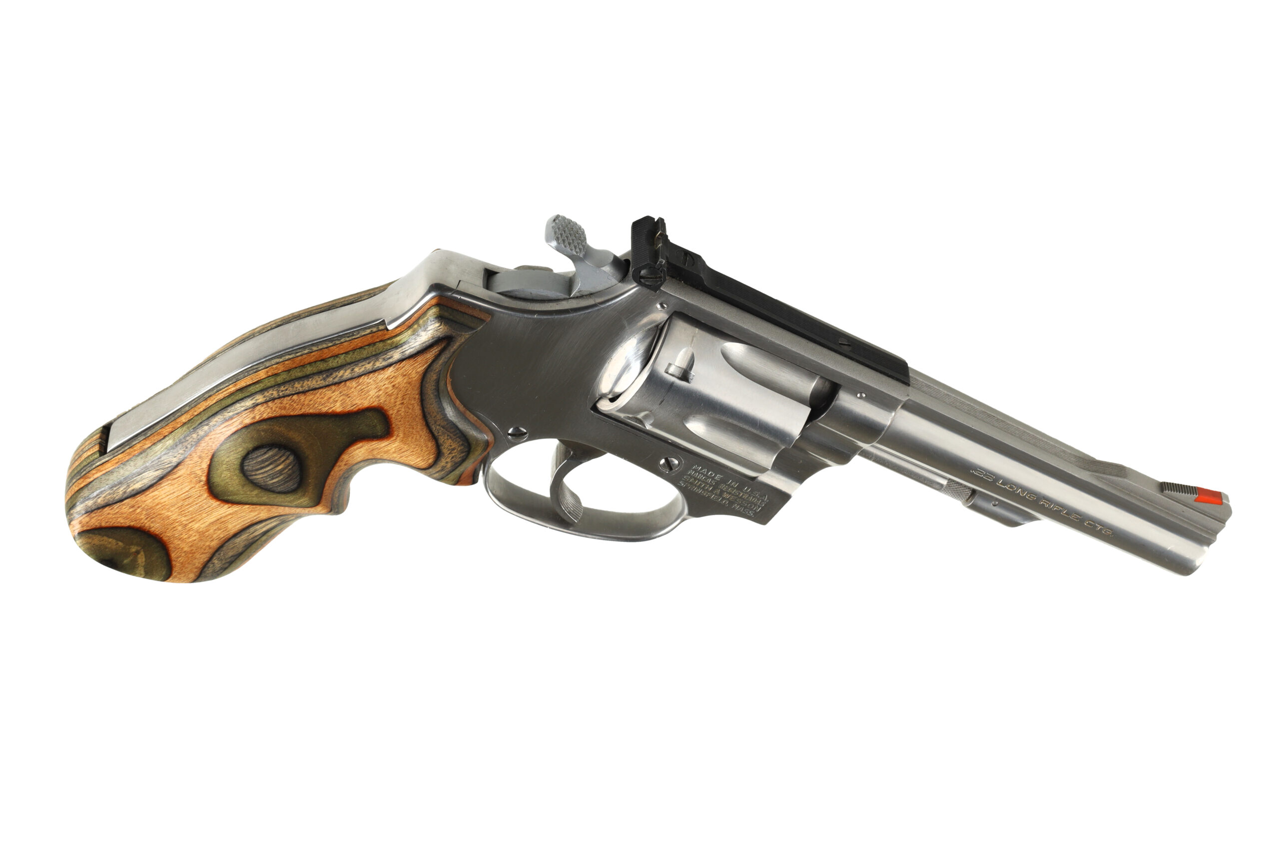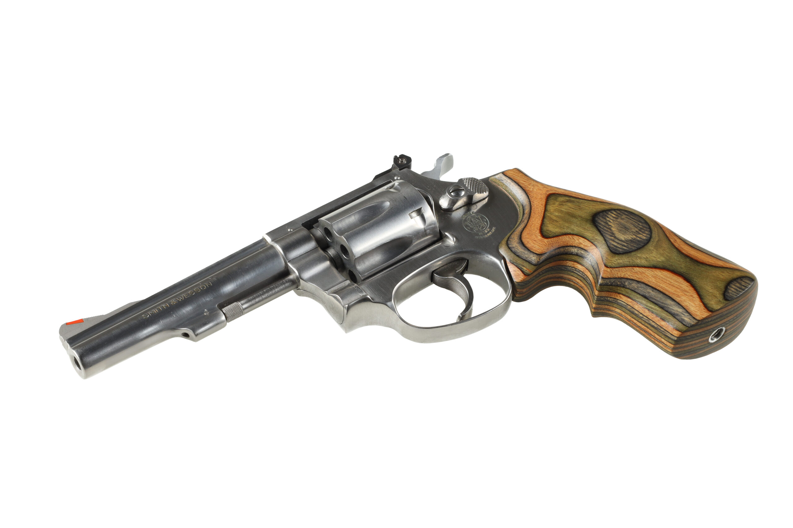The Model 63 is a full stainless J frame .22 revolver made in various configurations. this example is a Model 63 no dash, with a 4″ barrel, overall condition is very good, but the original grip has been swapped with a Hogue laminated wood grip.