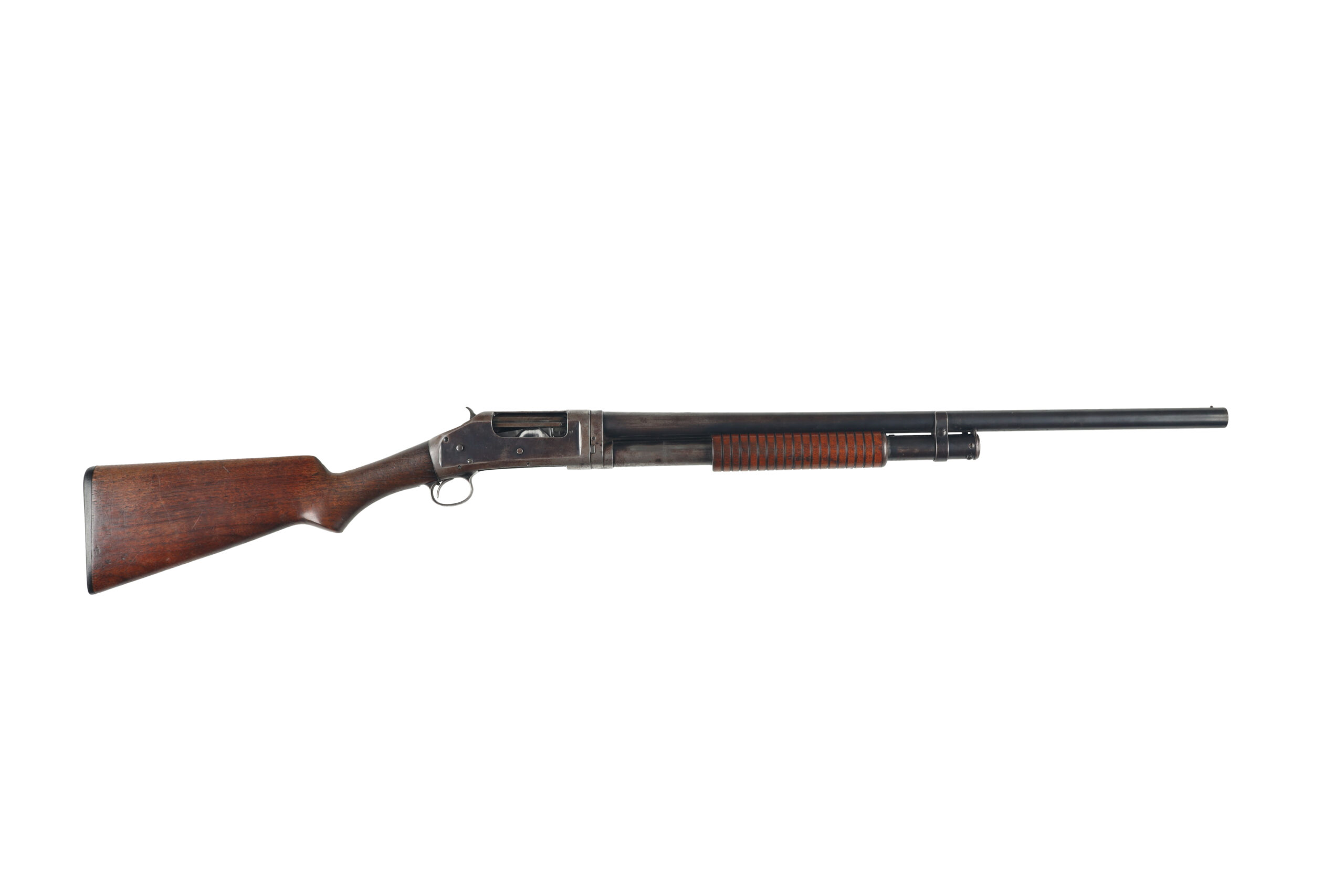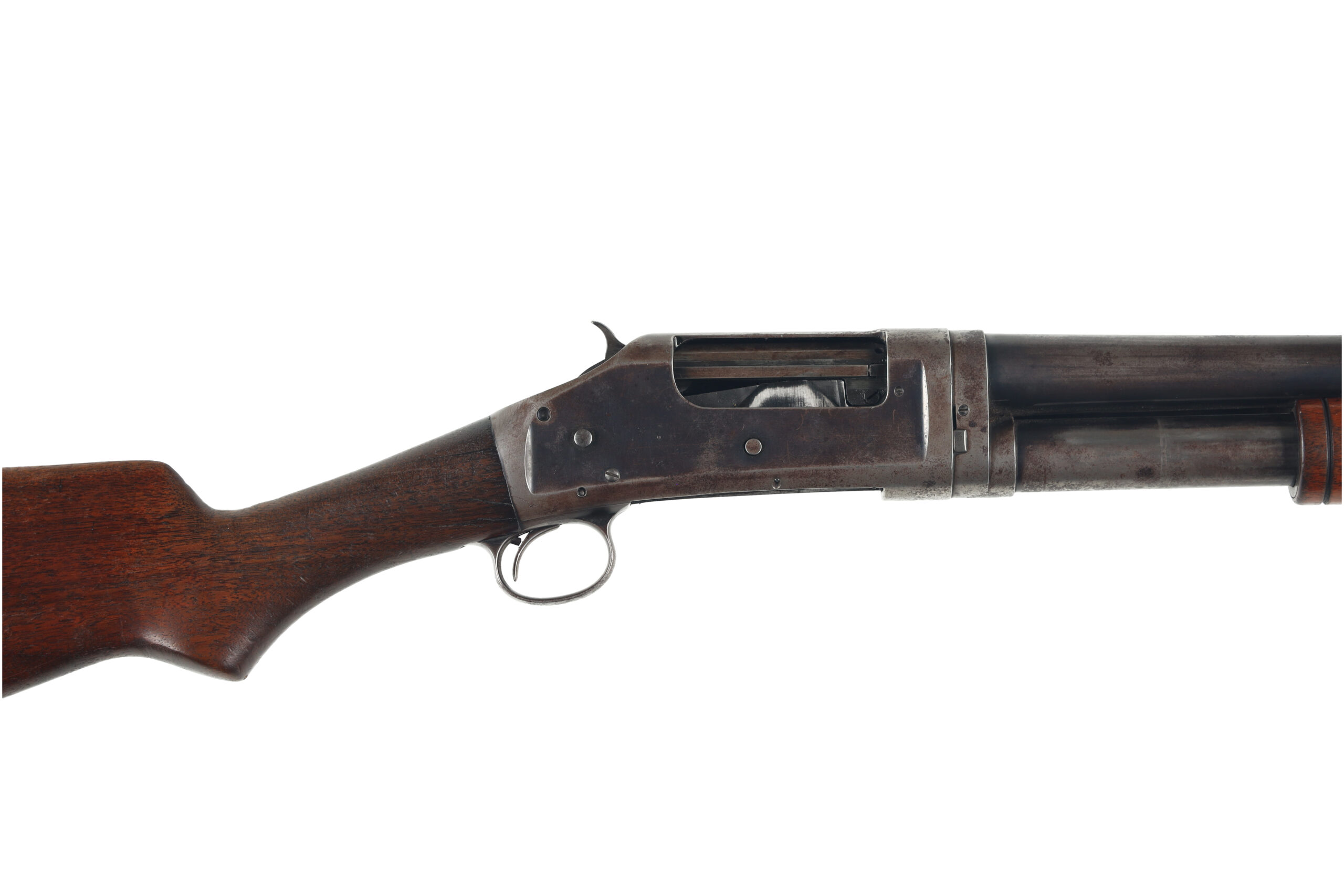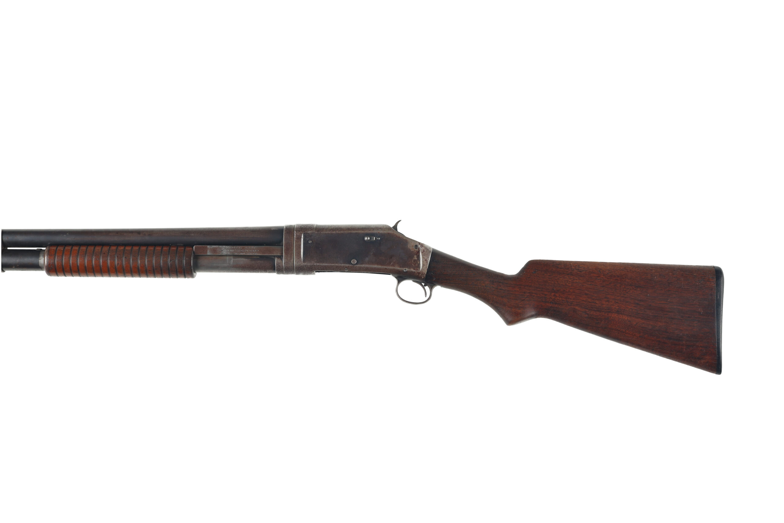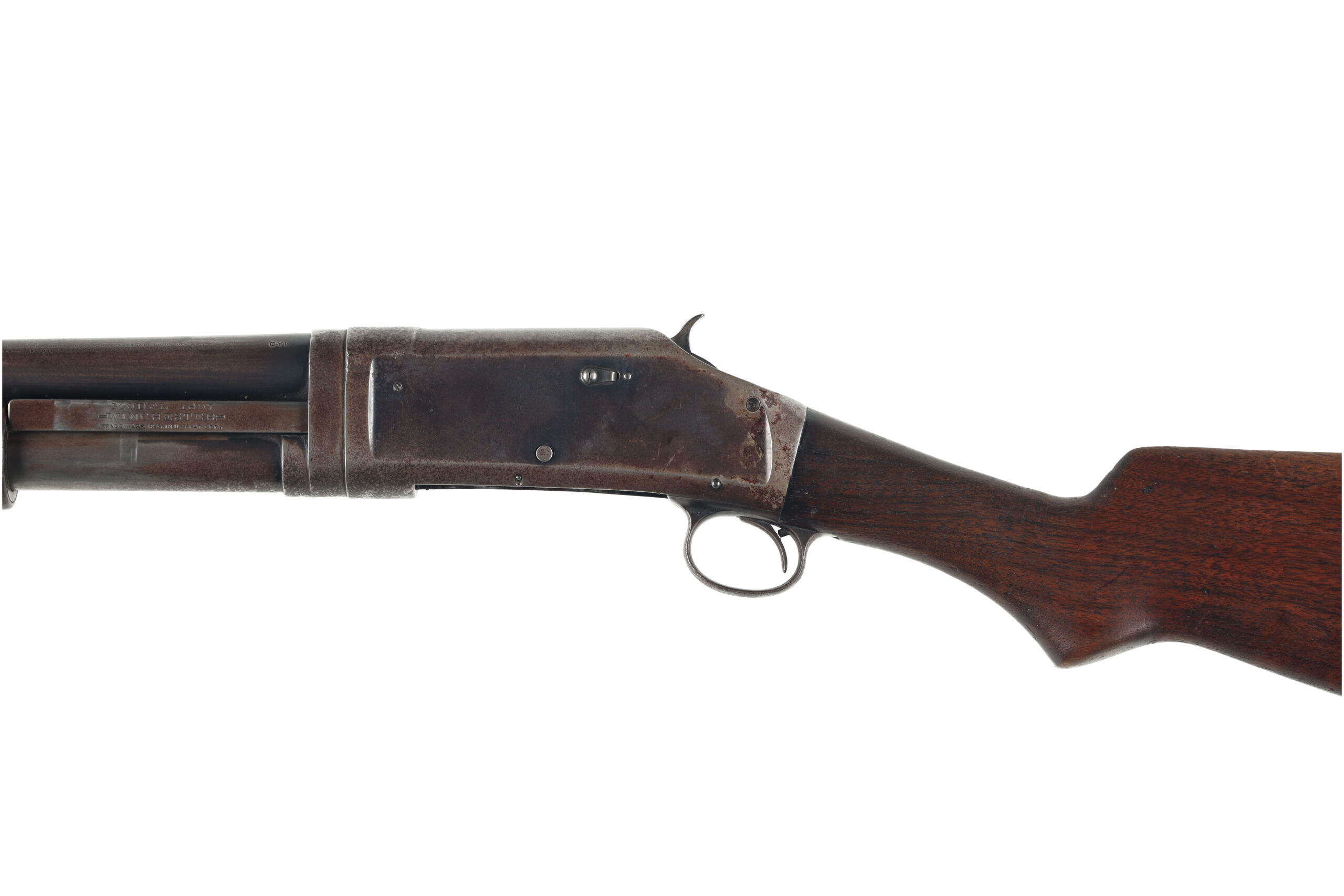 The Winchester Model 1897 was a design improvement of the earlier Browning designed Model 1893, which was made for lower pressure black powder shells. The model 1897 or “97” was one of the most prolific shotguns, with over a million produced by 1957. This example, made in 1916 has a rather worn surface finish, but appears to have no mechanical faults to the action. The stocks, like the metal is rather worn, and the buttstock is cracked at the wrist, needing repair.
