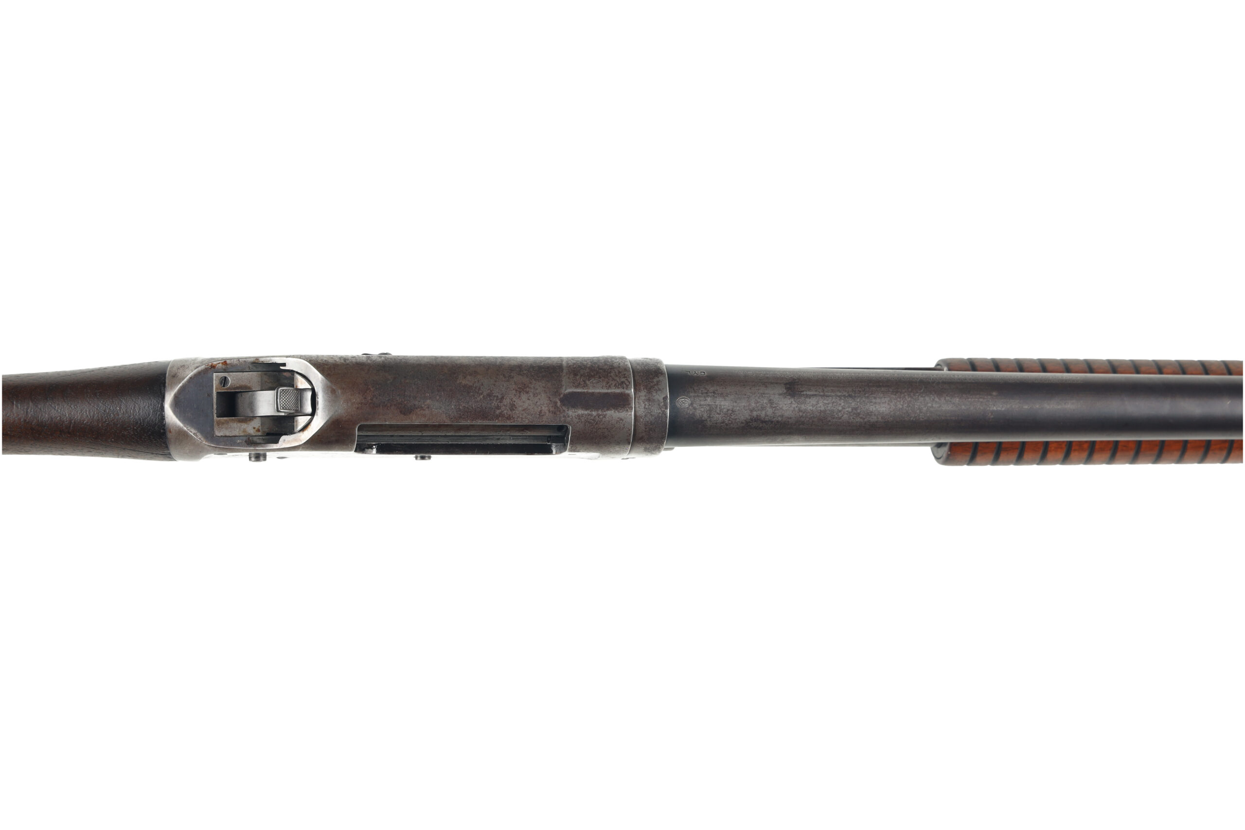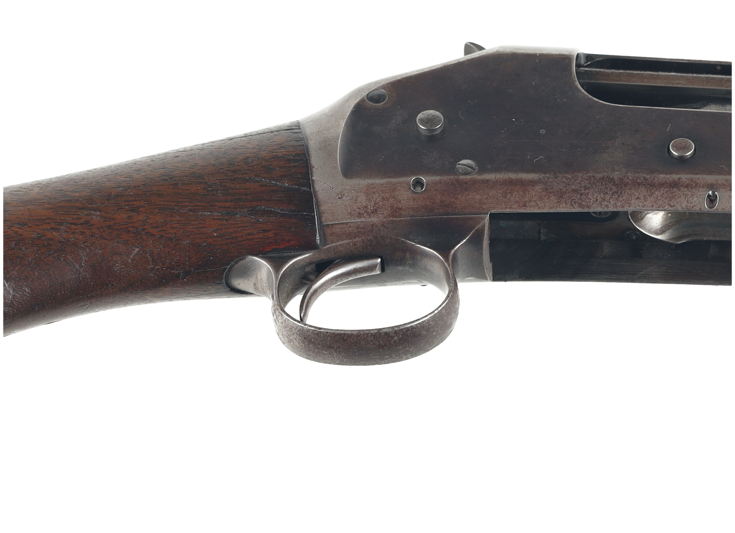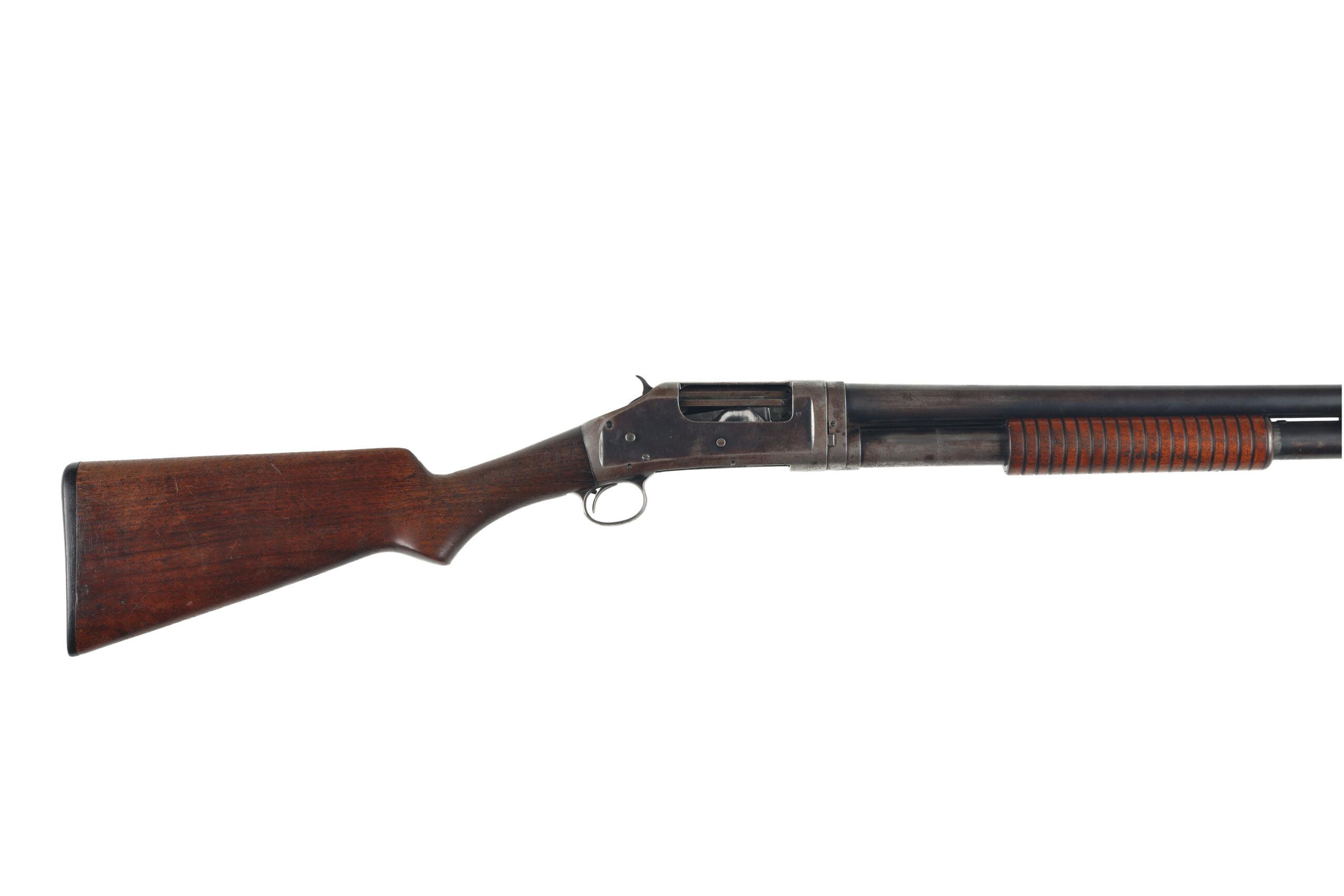 The Winchester Model 1897 was a design improvement of the earlier Browning designed Model 1893, which was made for lower pressure black powder shells. The model 1897 or “97” was one of the most prolific shotguns, with over a million produced by 1957. This example, made in 1916 has a rather worn surface finish, but appears to have no mechanical faults to the action. The stocks, like the metal is rather worn, and the buttstock is cracked at the wrist, needing repair.