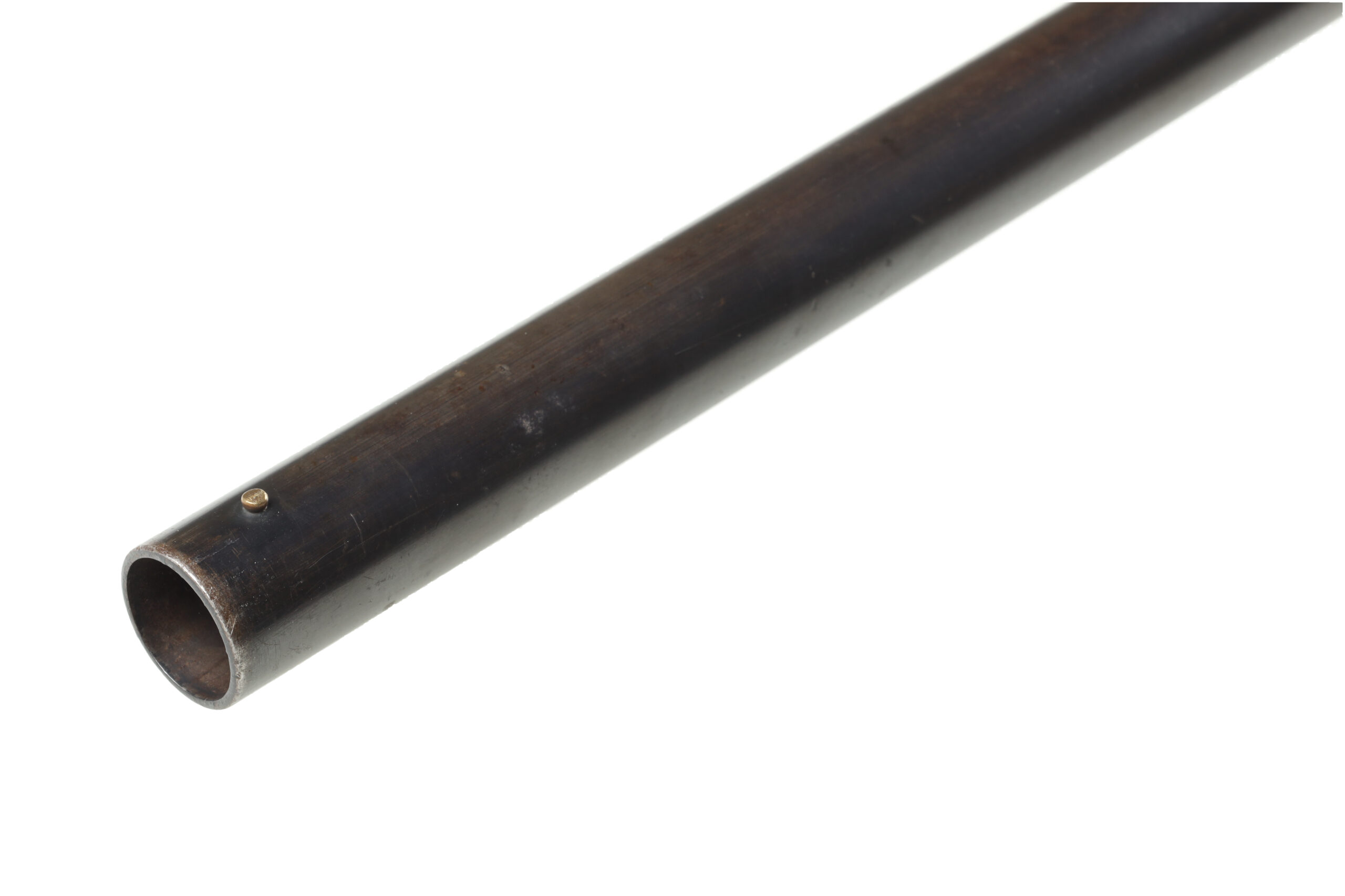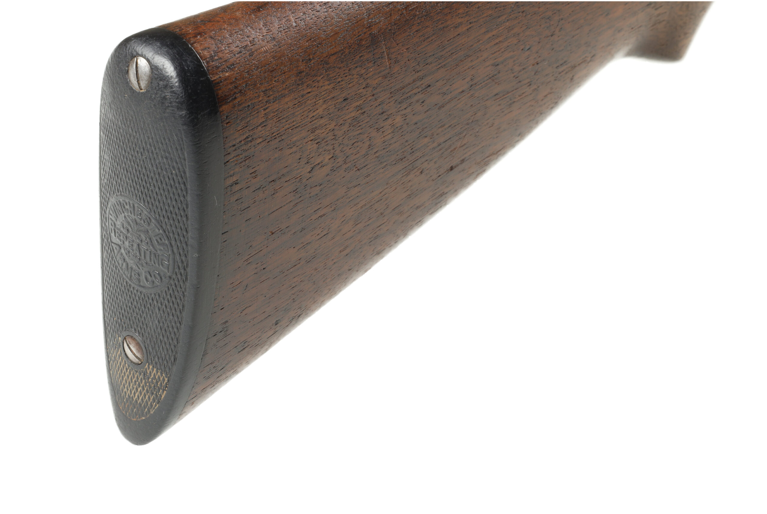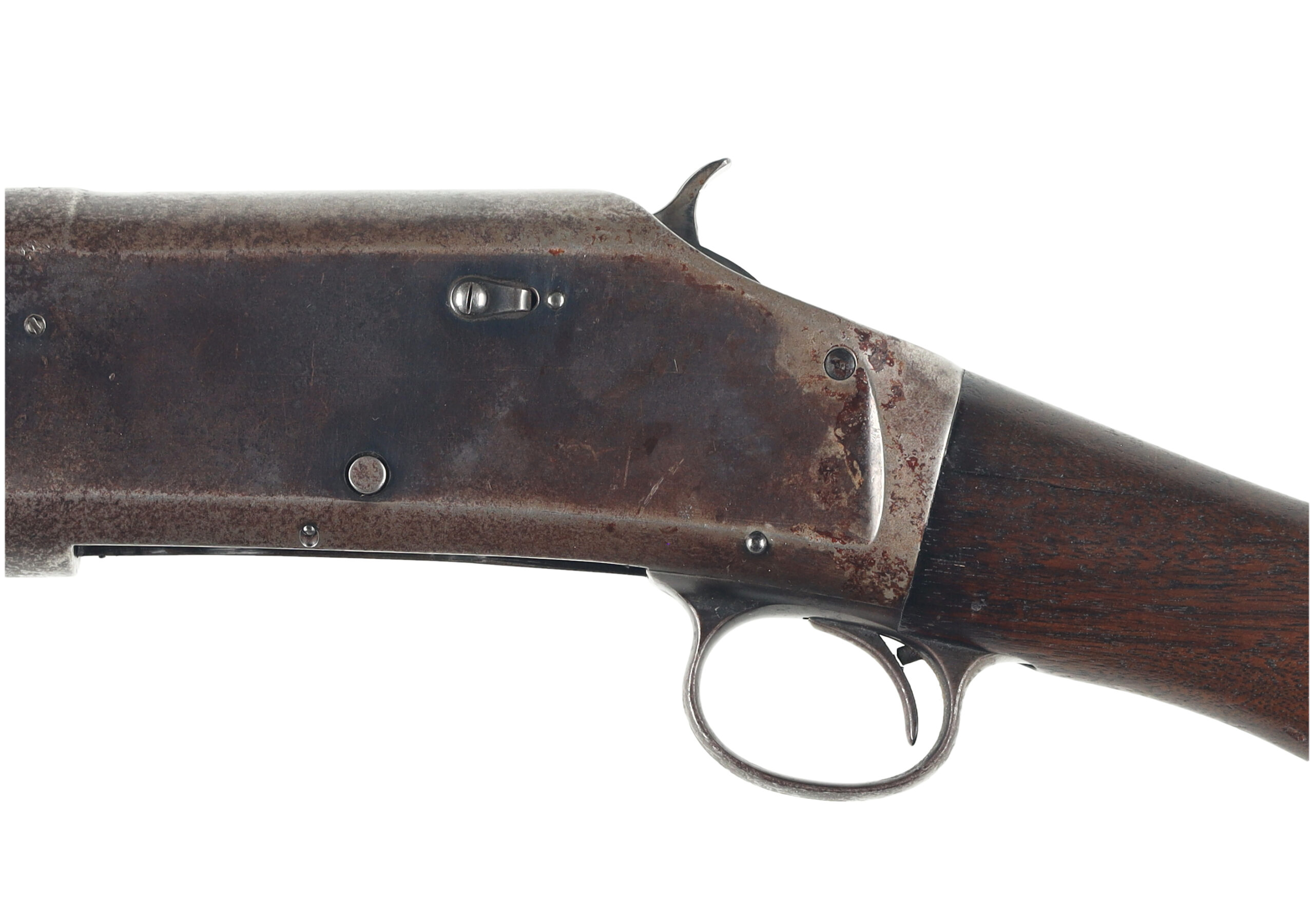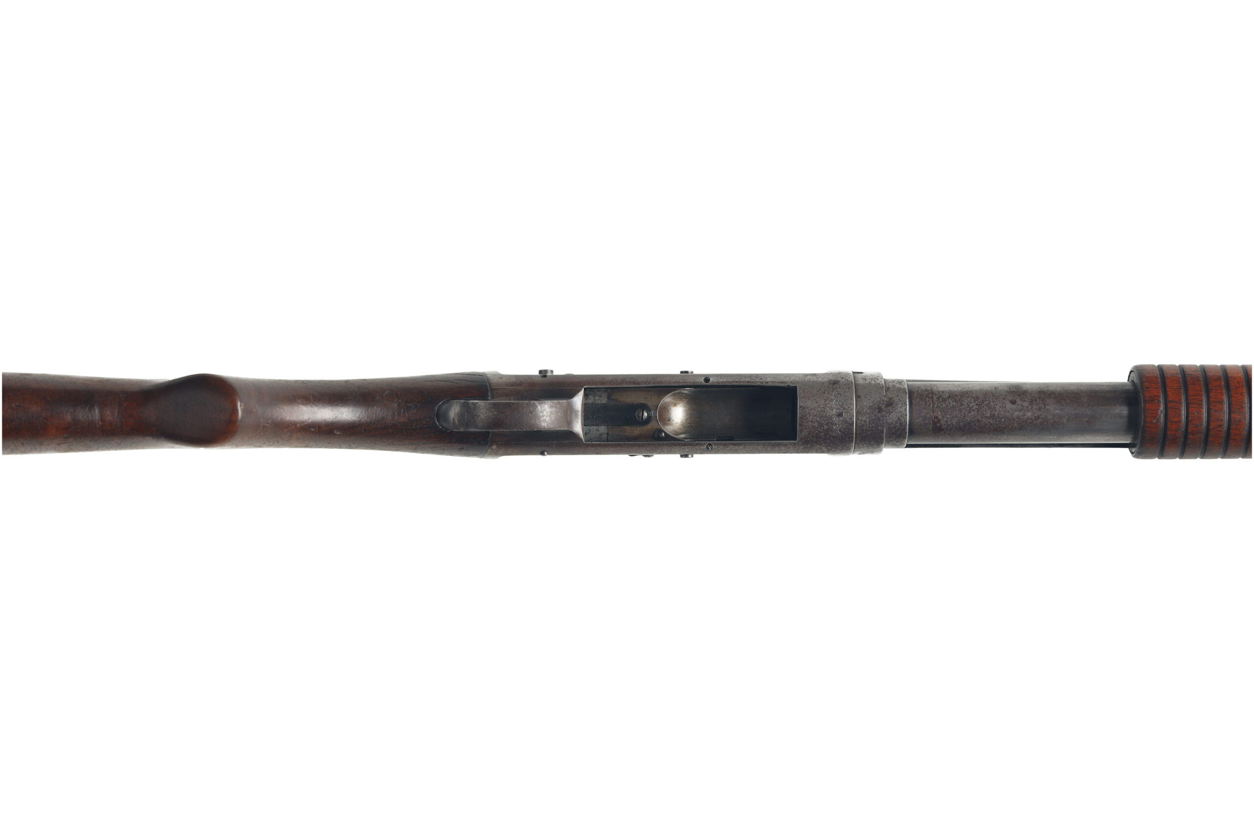 The Winchester Model 1897 was a design improvement of the earlier Browning designed Model 1893, which was made for lower pressure black powder shells. The model 1897 or “97” was one of the most prolific shotguns, with over a million produced by 1957. This example, made in 1916 has a rather worn surface finish, but appears to have no mechanical faults to the action. The stocks, like the metal is rather worn, and the buttstock is cracked at the wrist, needing repair.