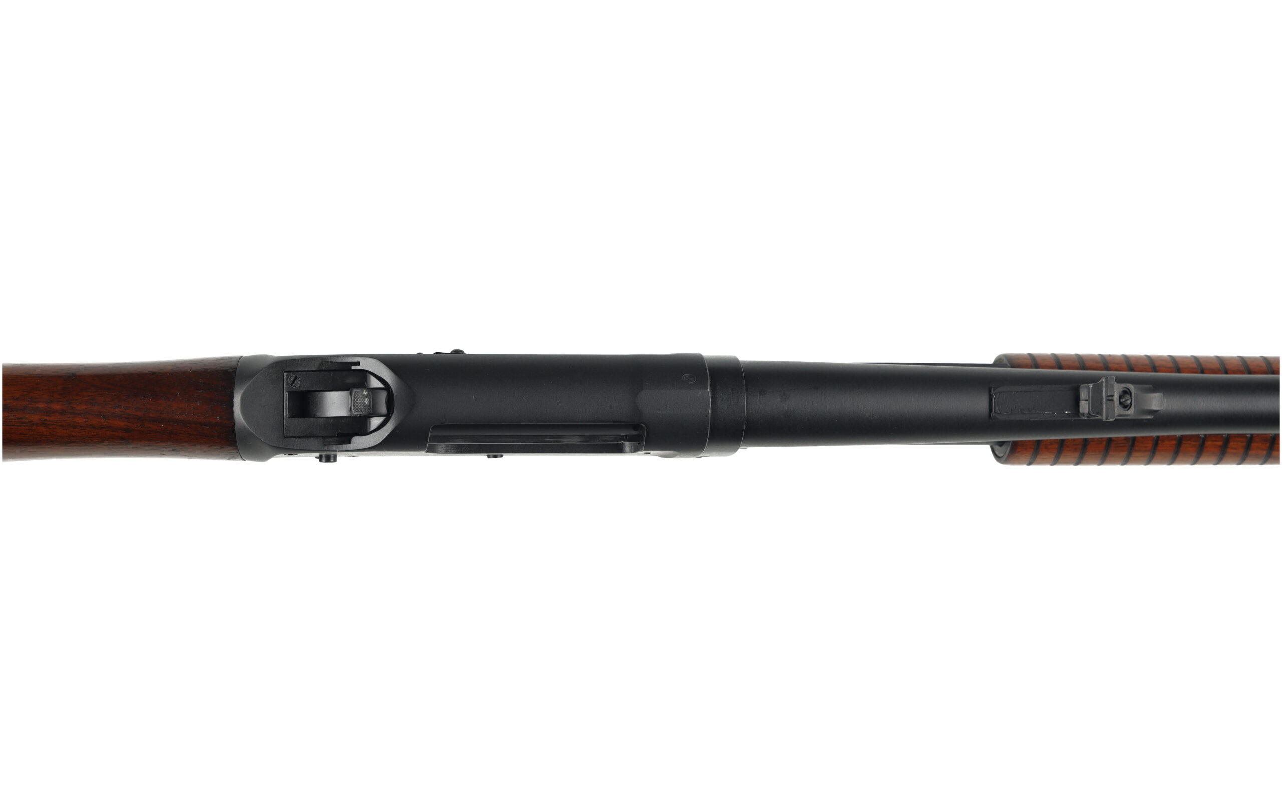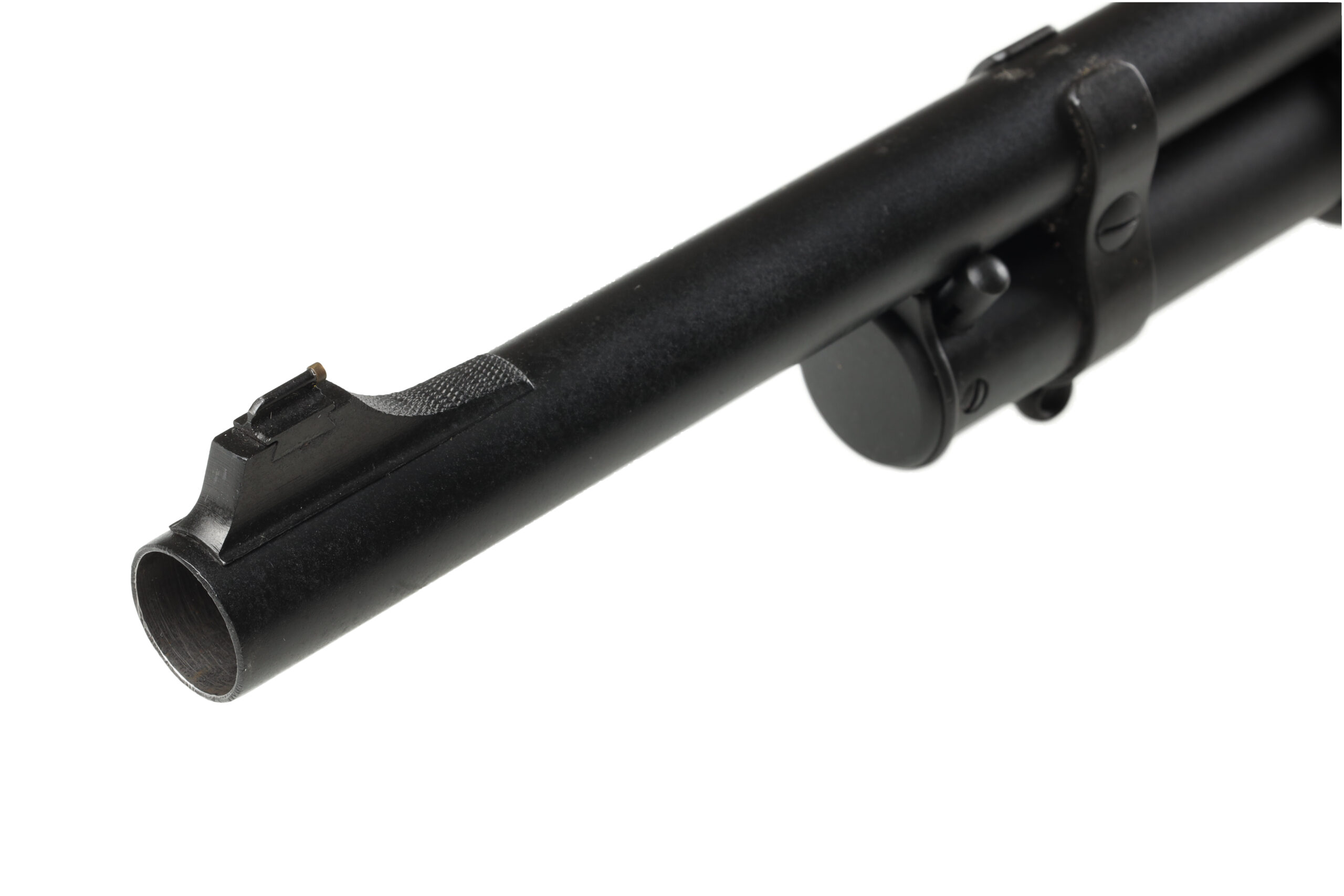 The Winchester Model 1897 was a design improvement of the earlier Browning designed Model 1893, which was made for lower pressure black powder shells. The model 1897 or “97” was one of the most prolific shotguns, with over a million produced by 1957. This example, made in 1946, has been entirely rebuilt as a slug gun, with its barrel cut to just over 20″ and what appears to be a set of Remington BDL sights installed across the top of the barrel. the finish also has been entirely redone to a bead blasted and parkerized finish.